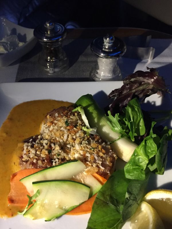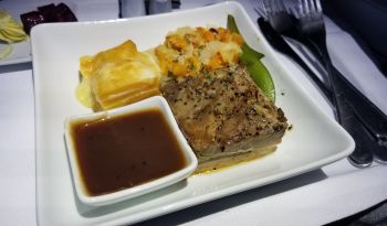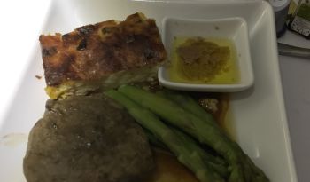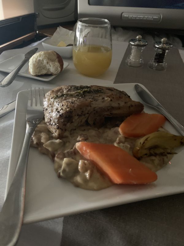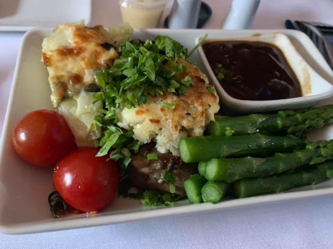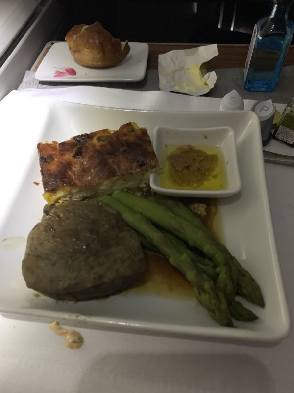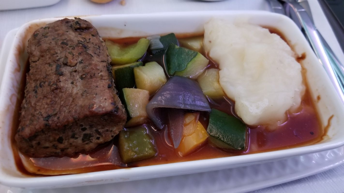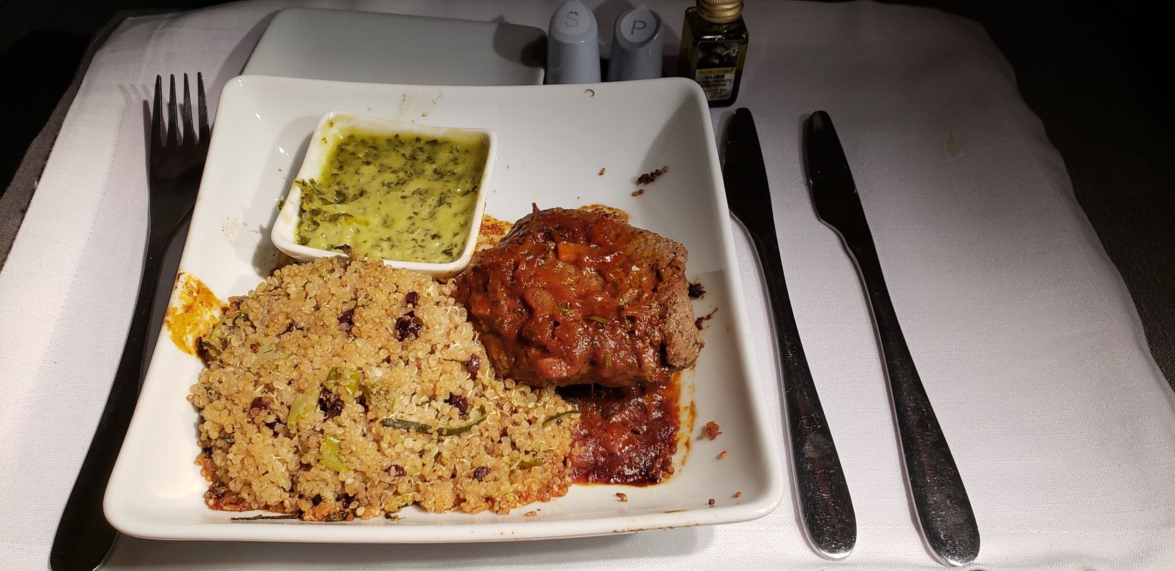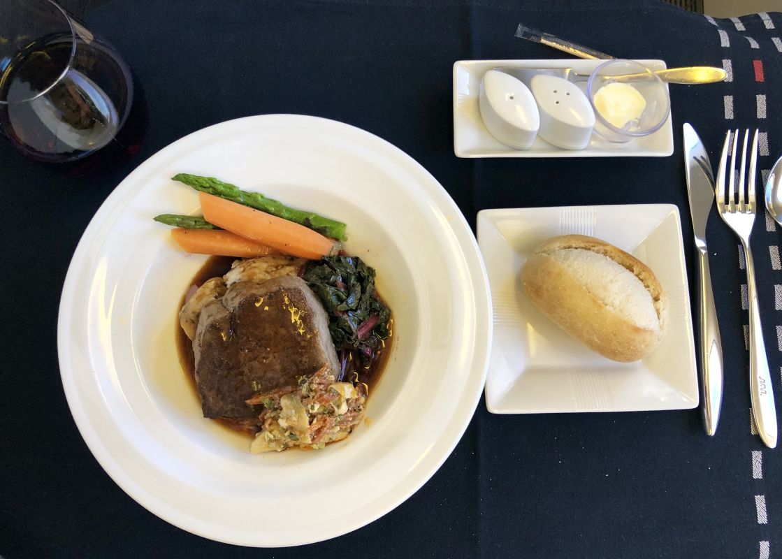 Porcini crusted filet mignon was amazing. By far the best meal I've had in the sky. Juicy and cooked medium.