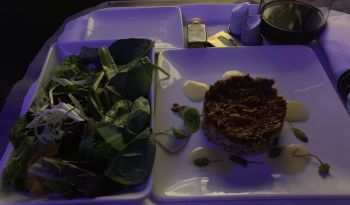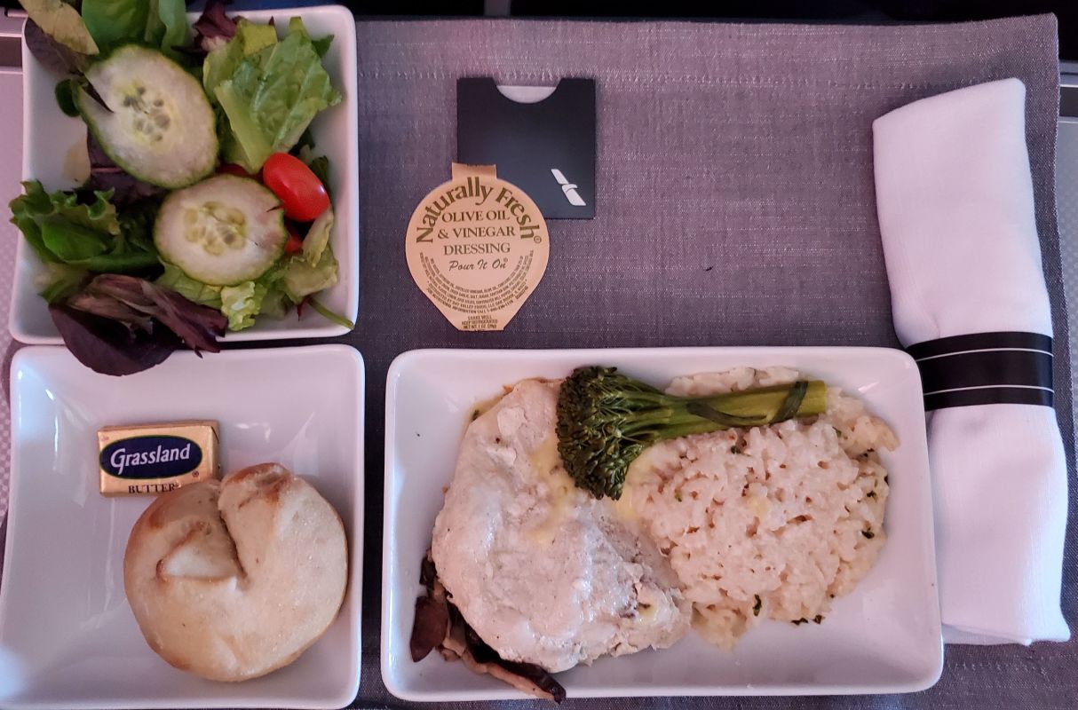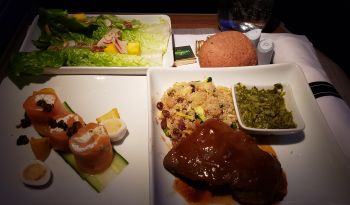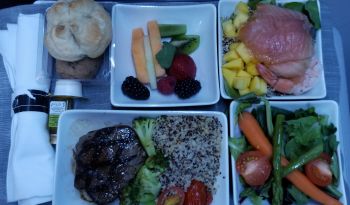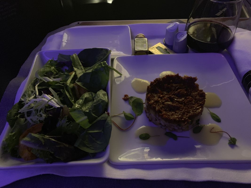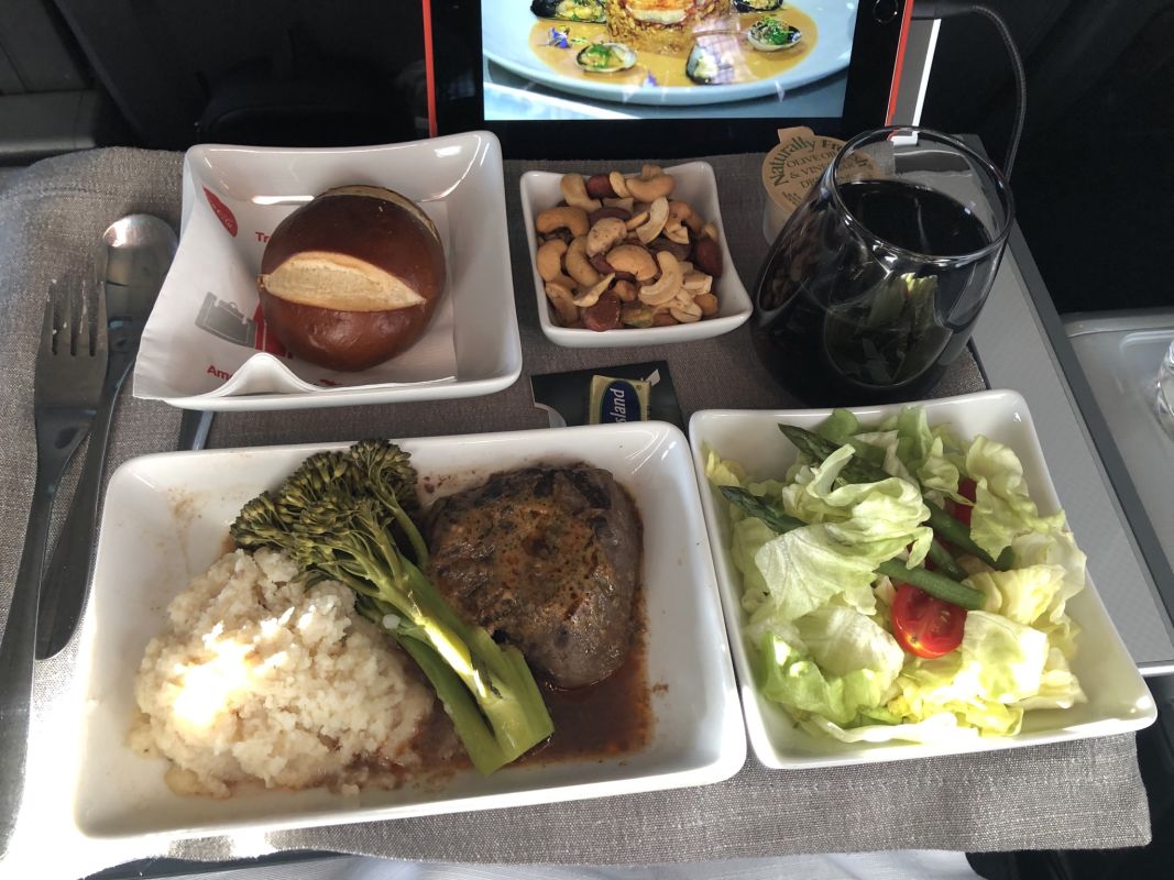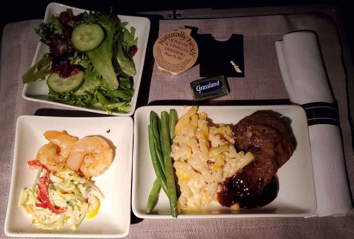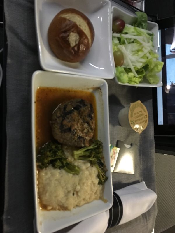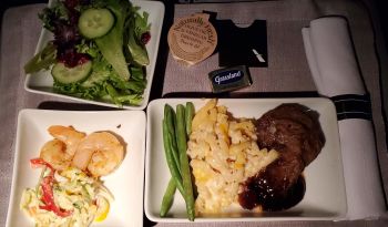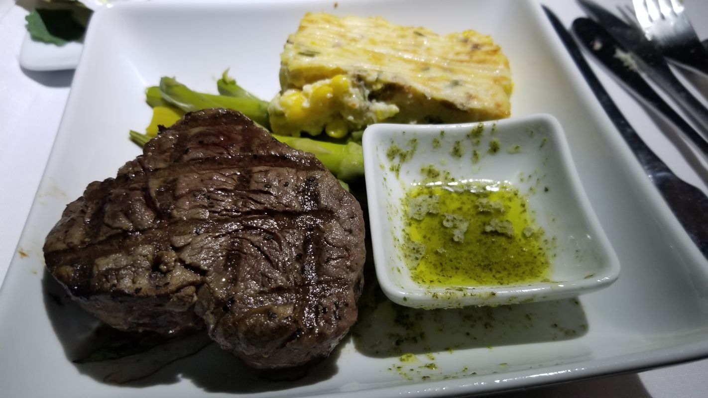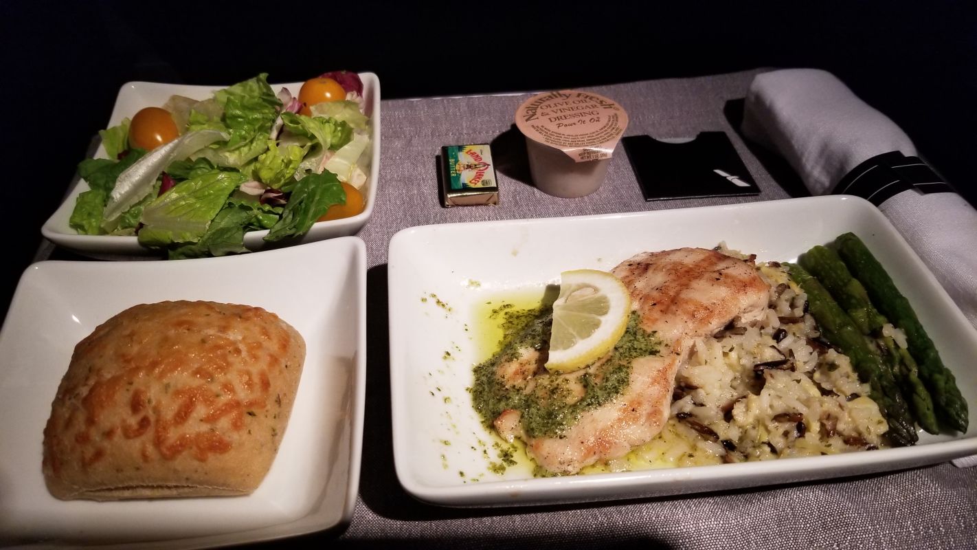 Porcini crusted filet mignon was amazing. By far the best meal I've had in the sky. Juicy and cooked medium.