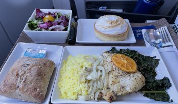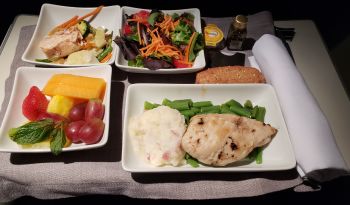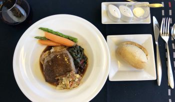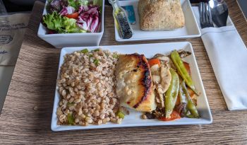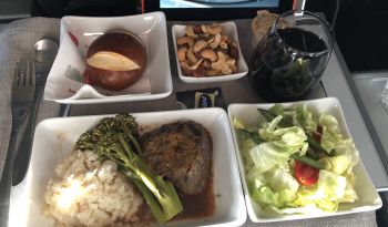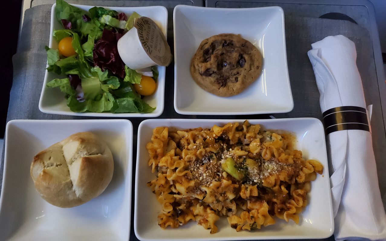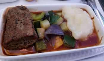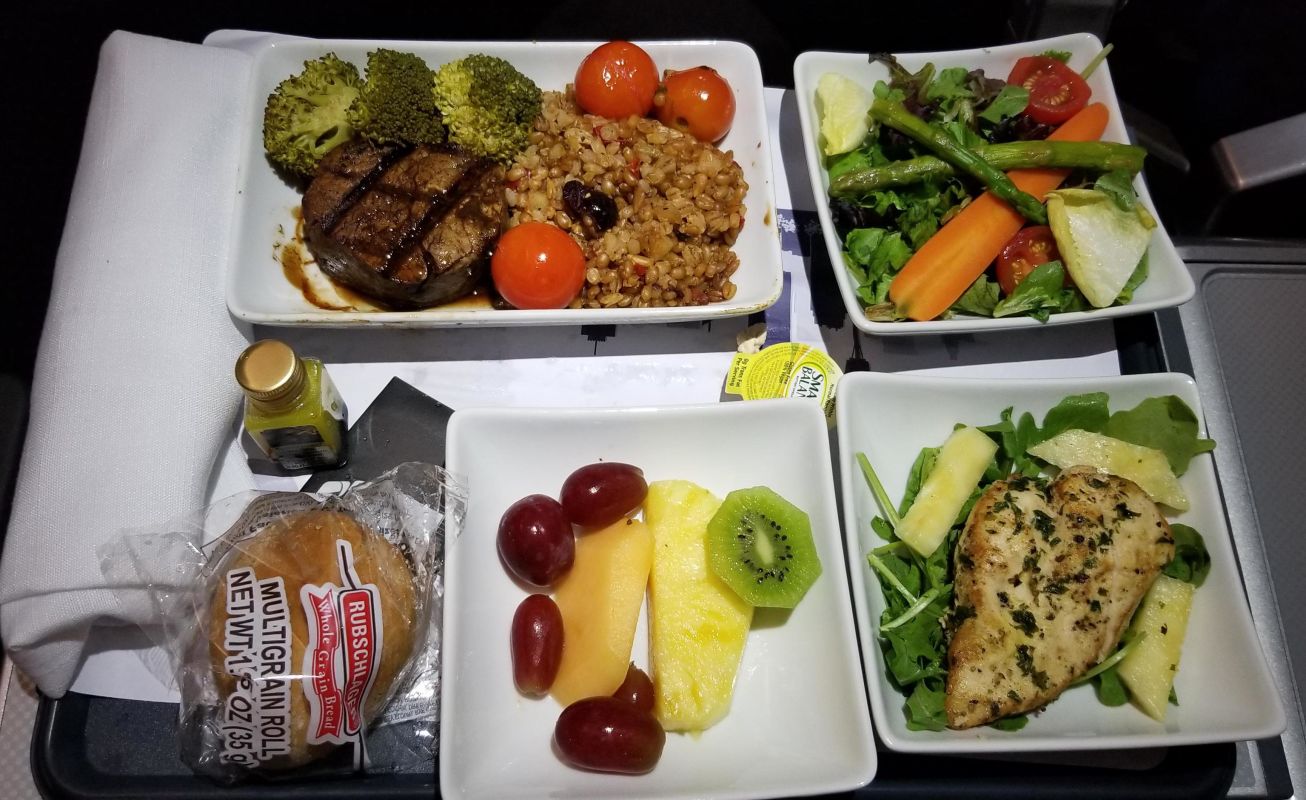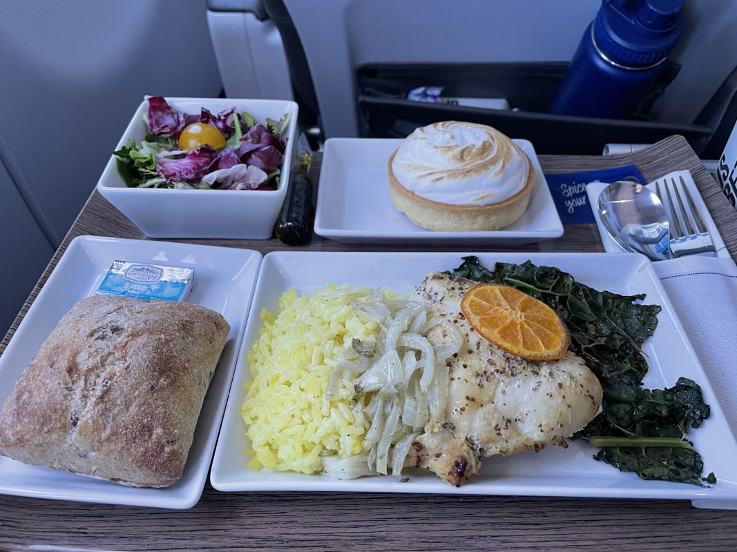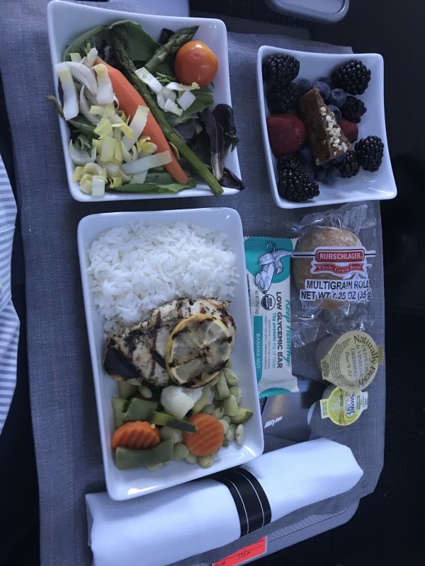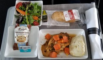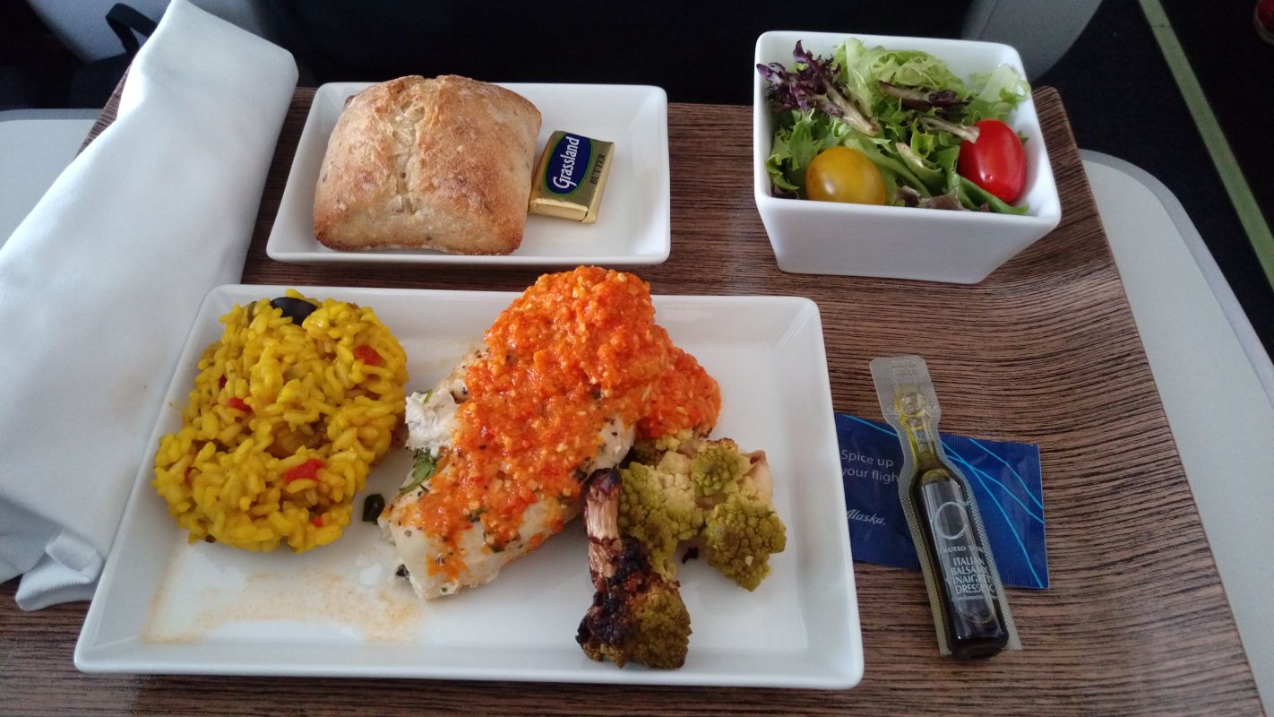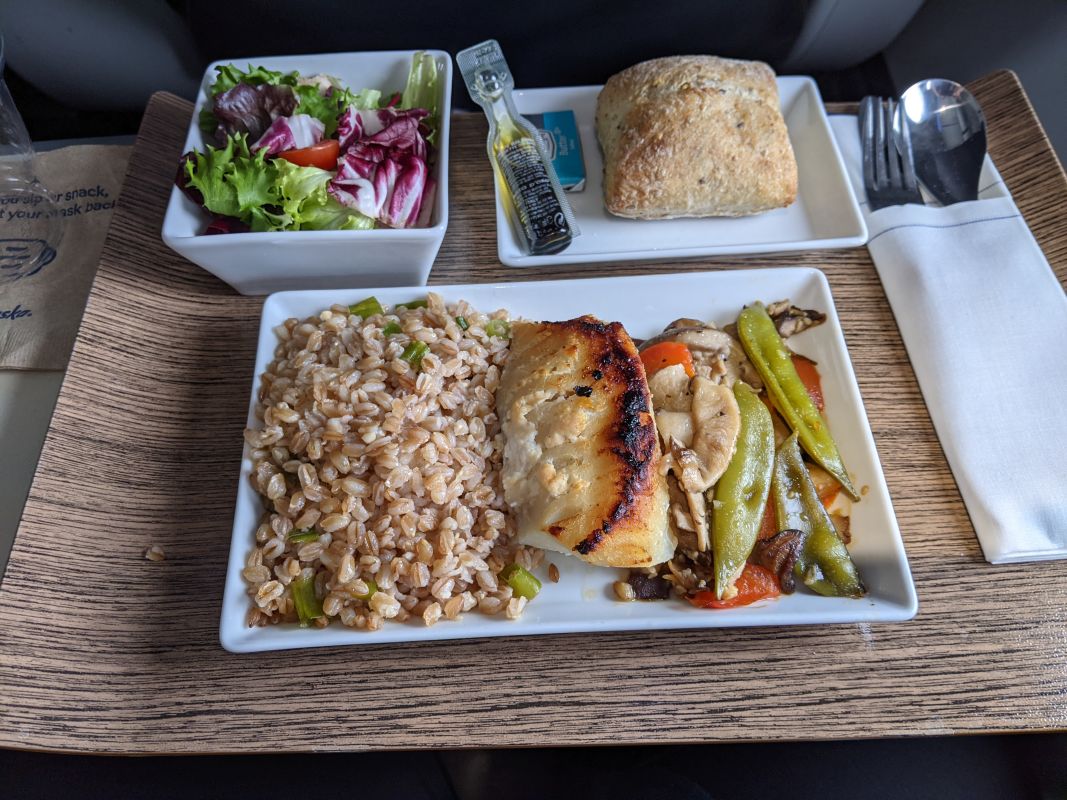 Porcini crusted filet mignon was amazing. By far the best meal I've had in the sky. Juicy and cooked medium.