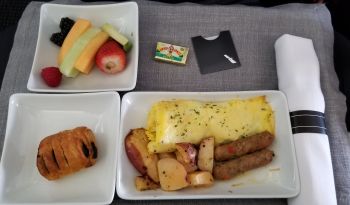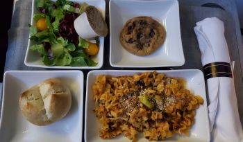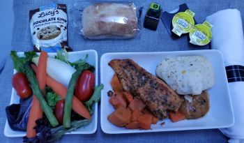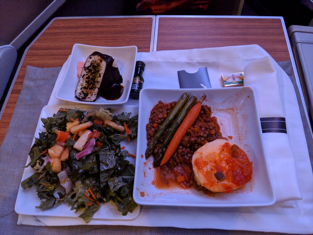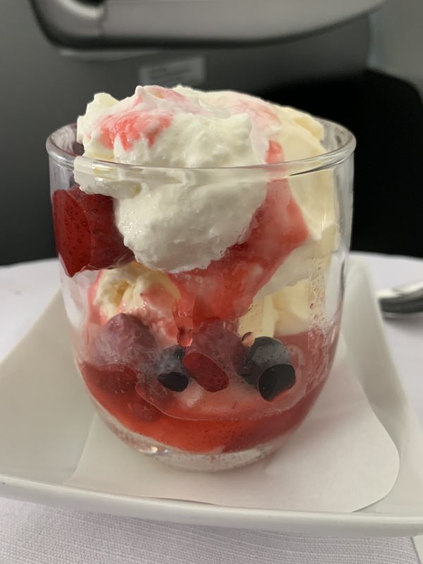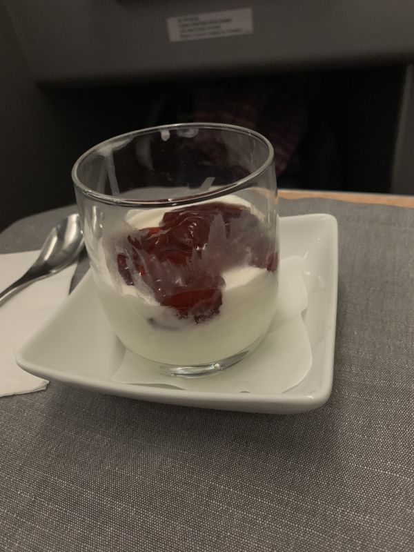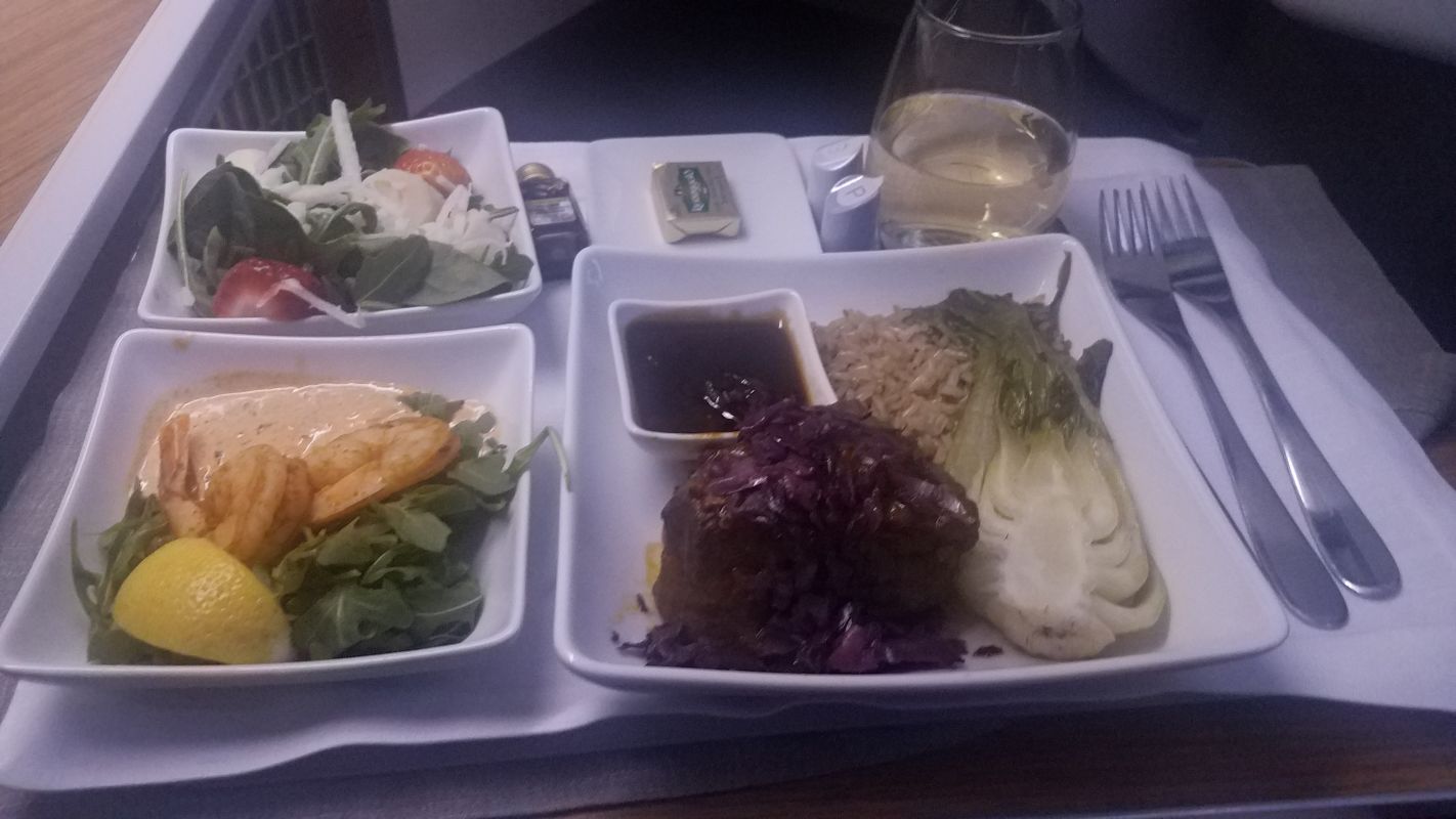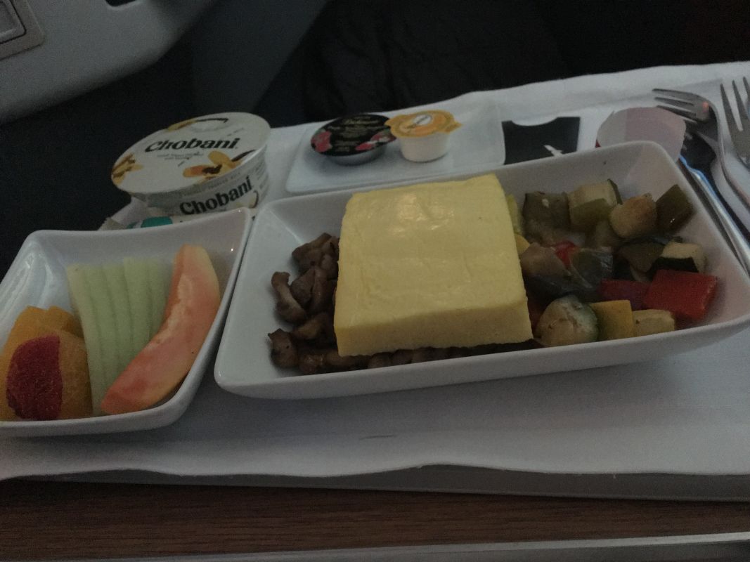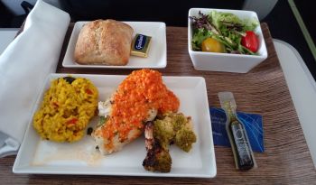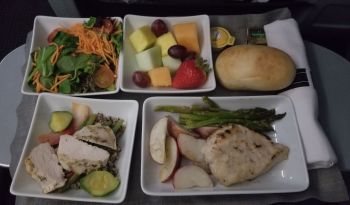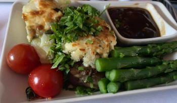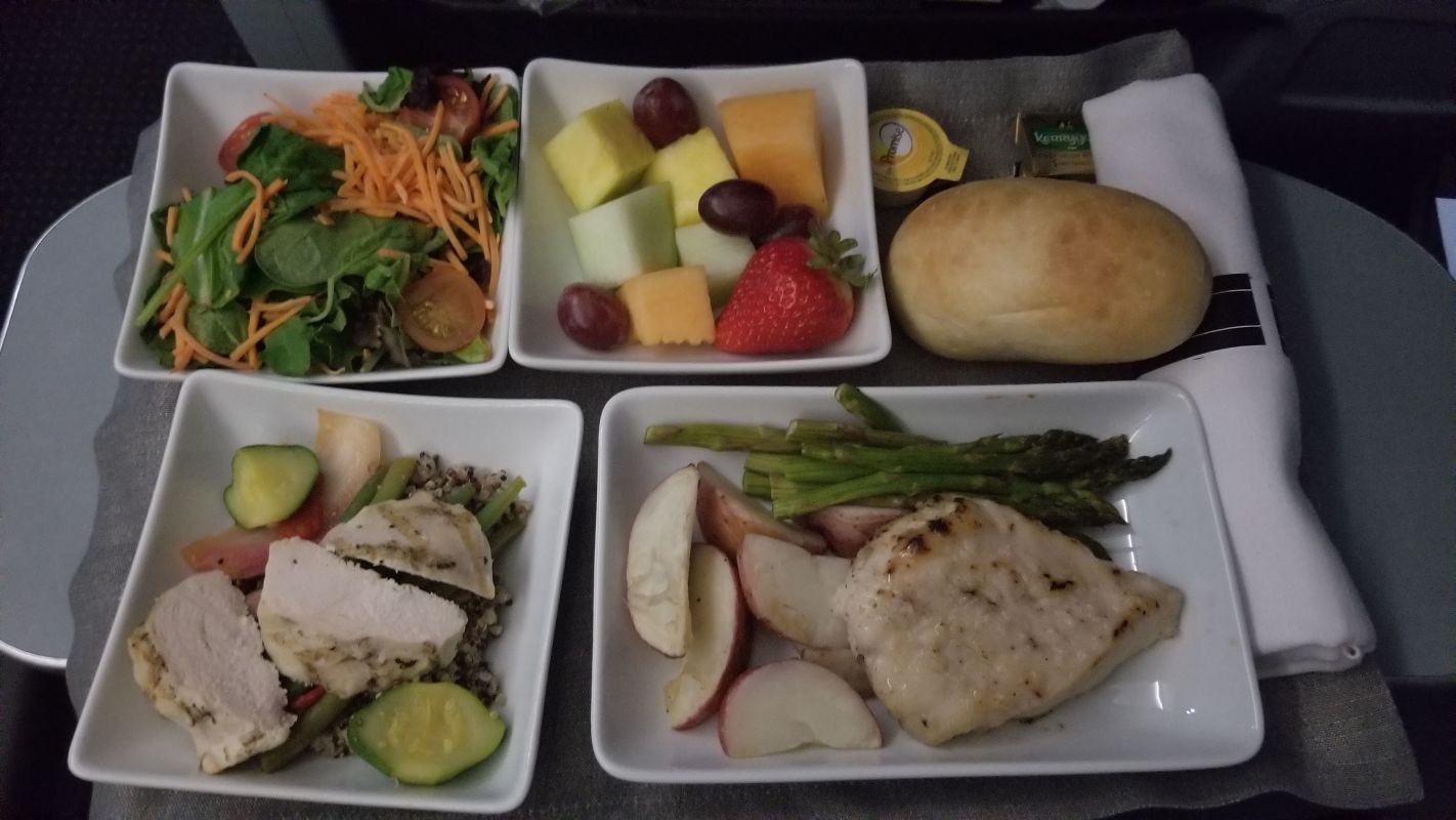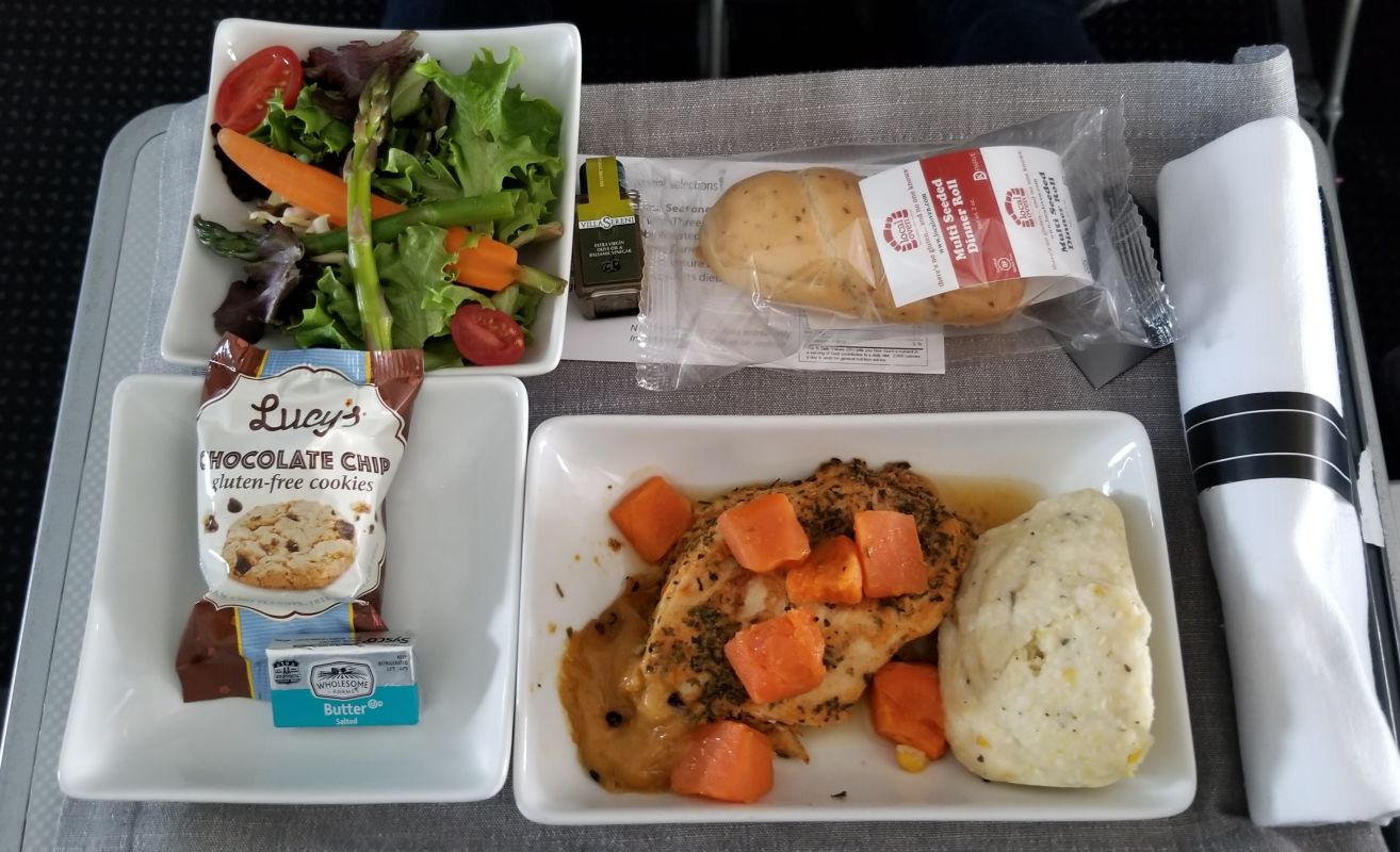 Porcini crusted filet mignon was amazing. By far the best meal I've had in the sky. Juicy and cooked medium.