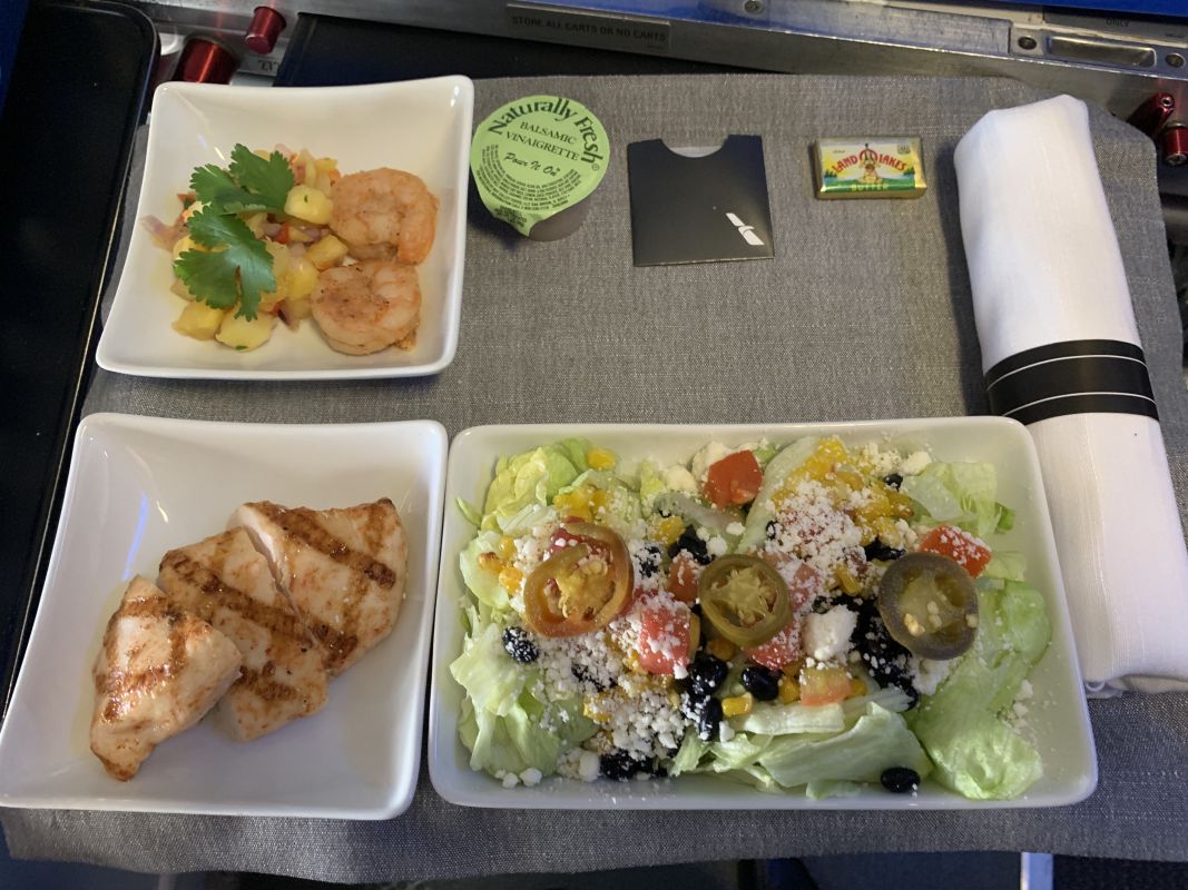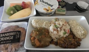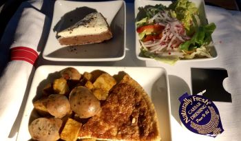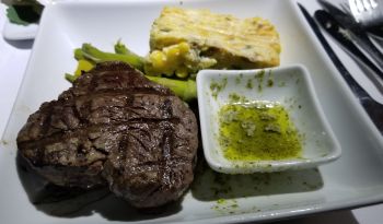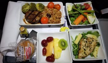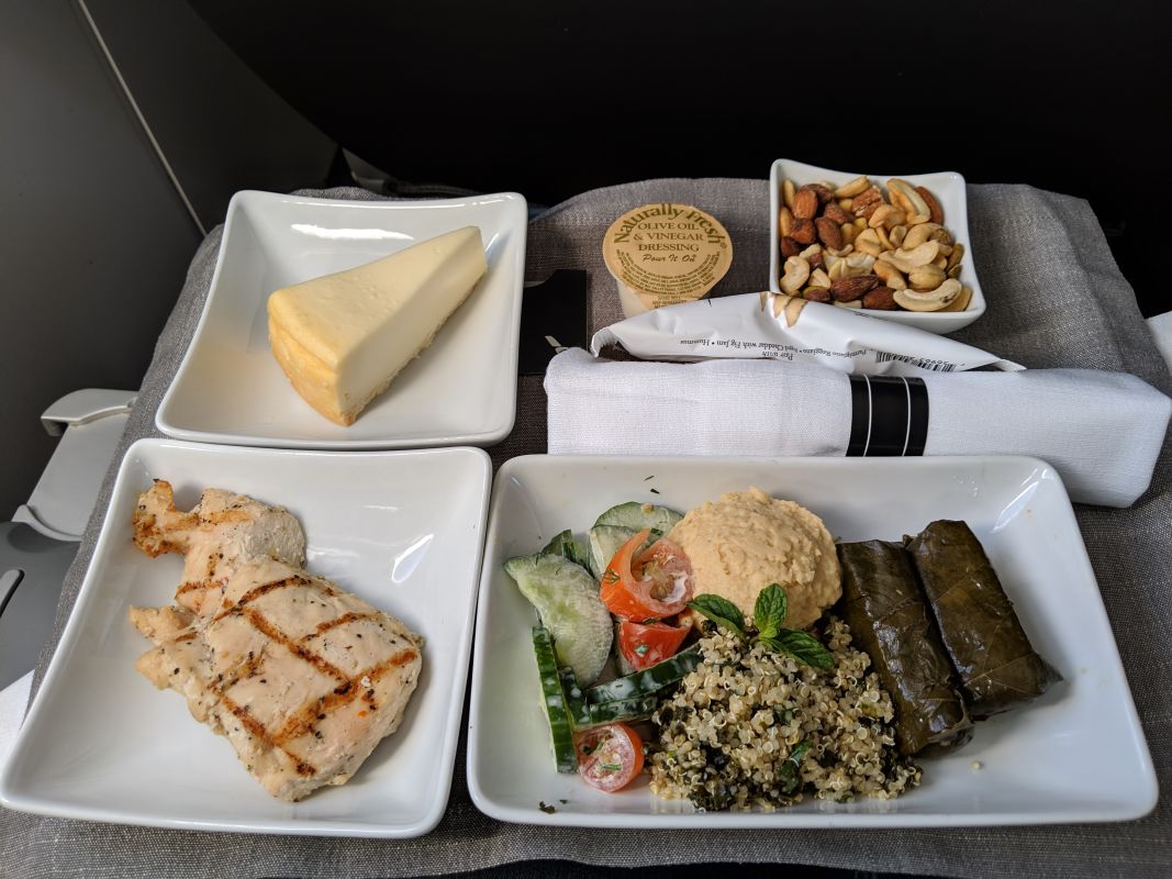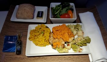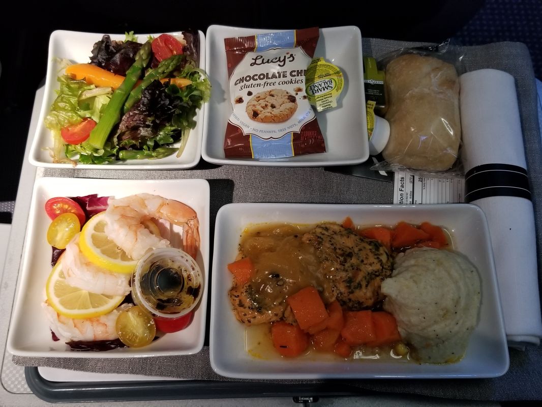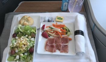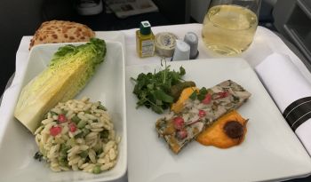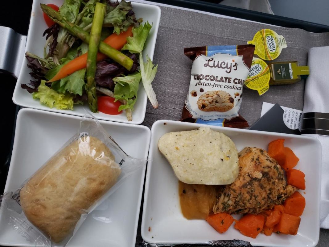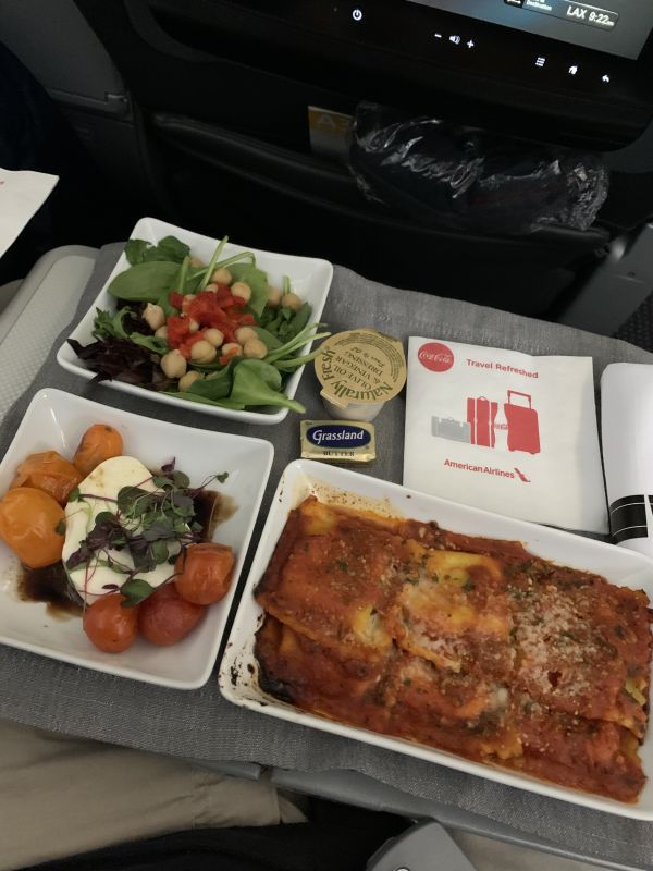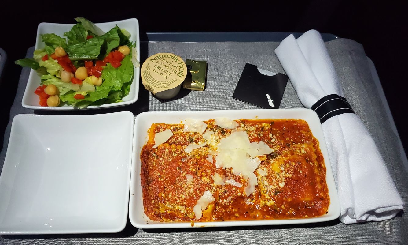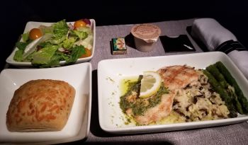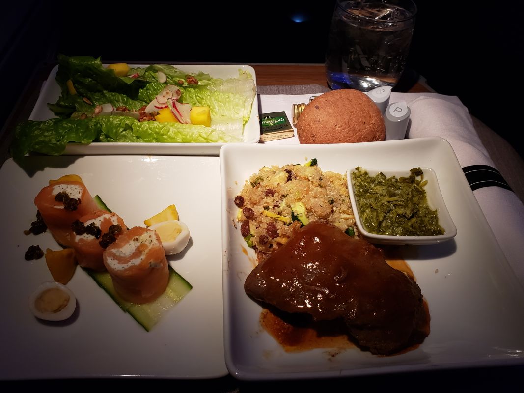 Porcini crusted filet mignon was amazing. By far the best meal I've had in the sky. Juicy and cooked medium.