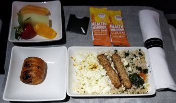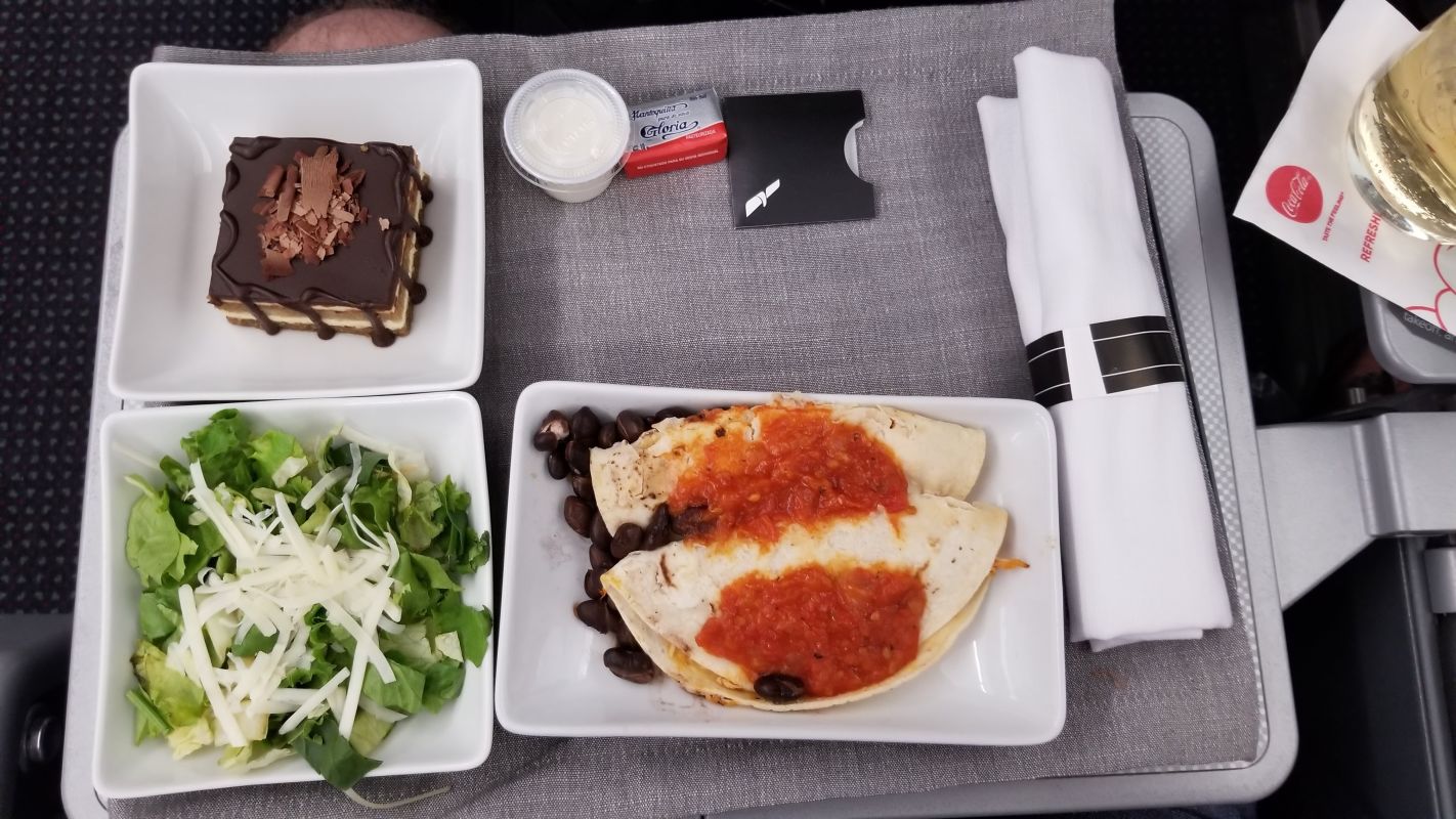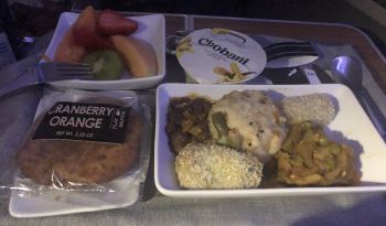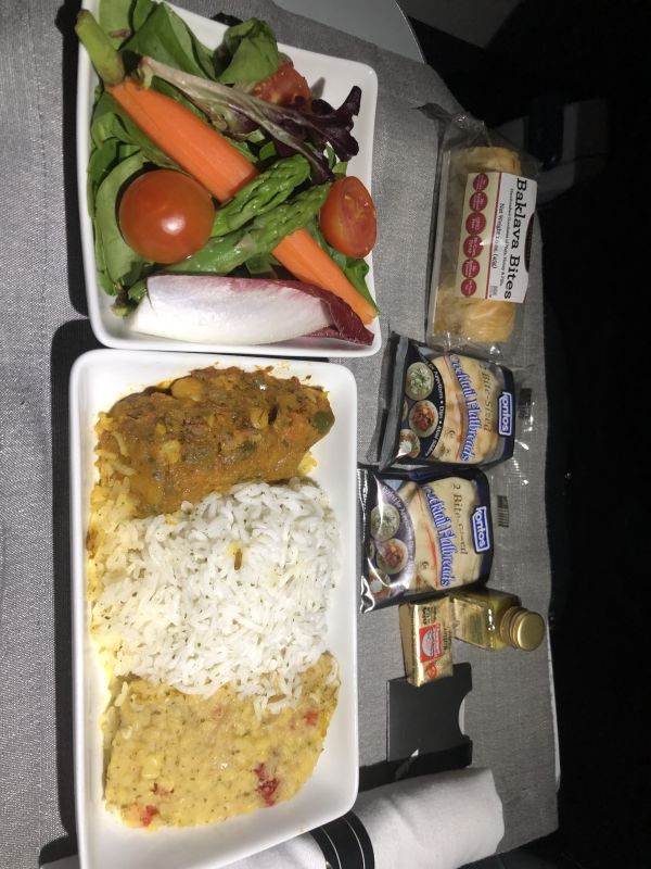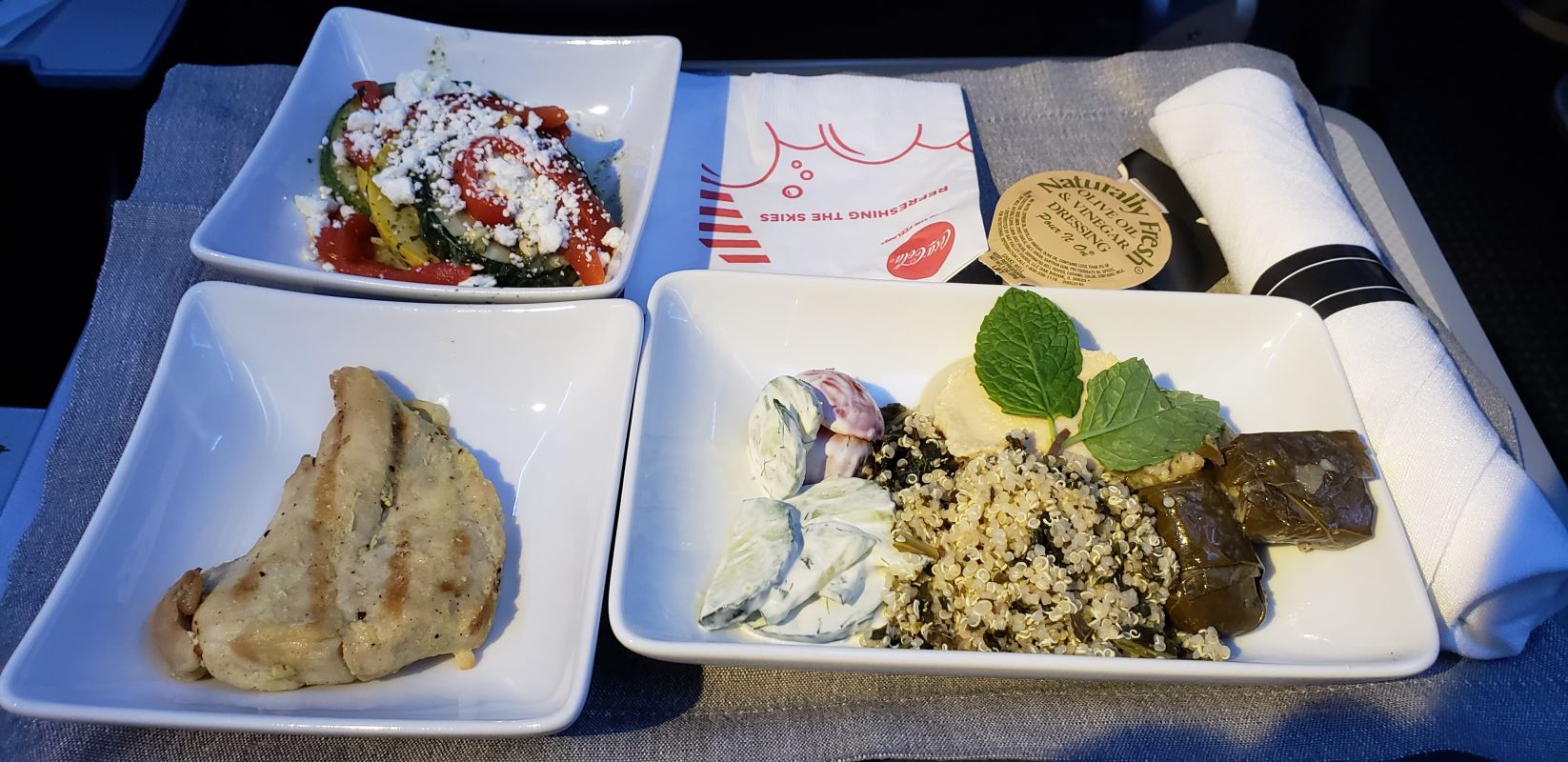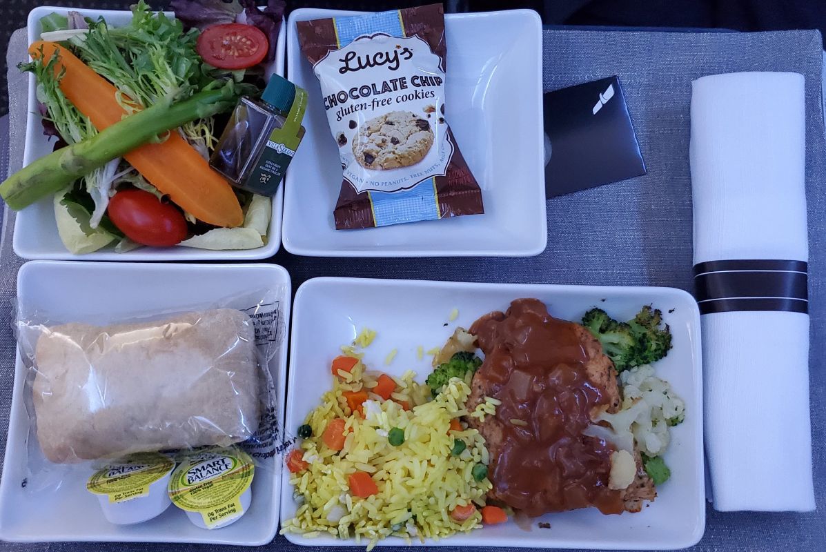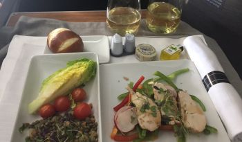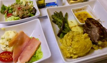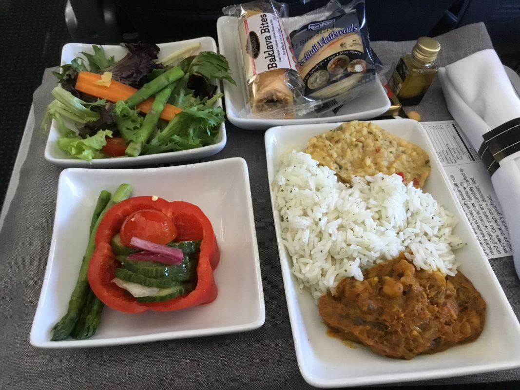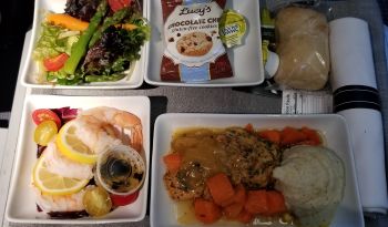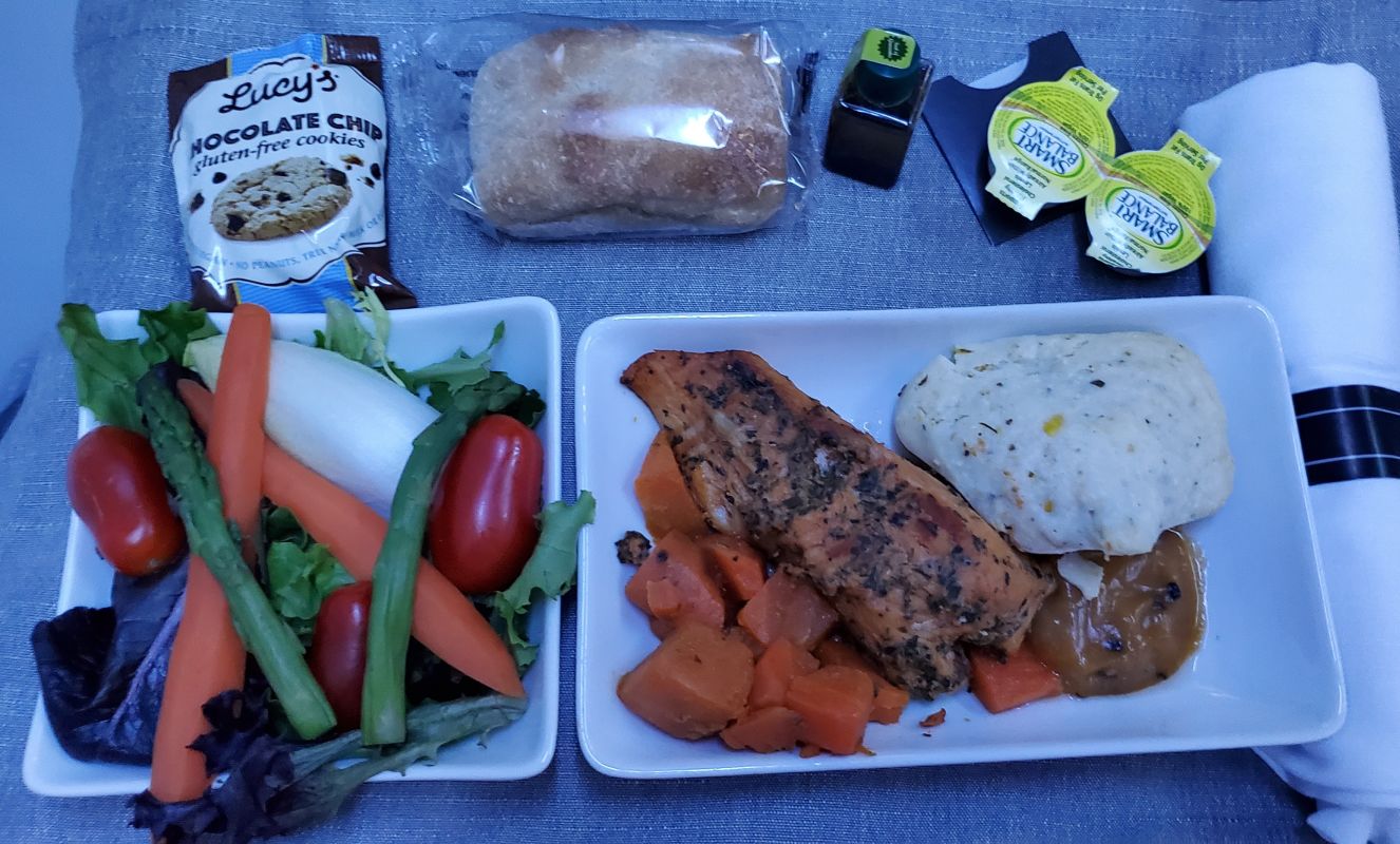 Porcini crusted filet mignon was amazing. By far the best meal I've had in the sky. Juicy and cooked medium.
