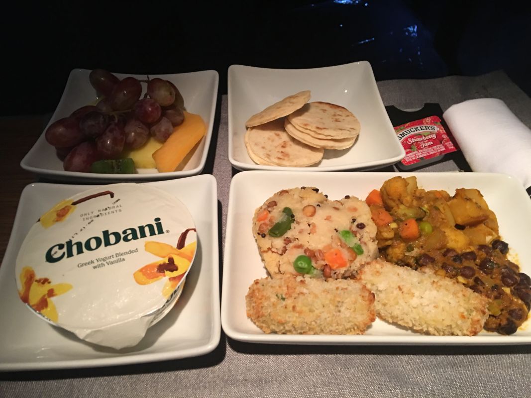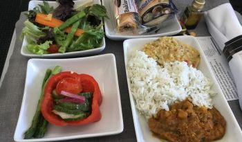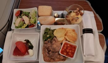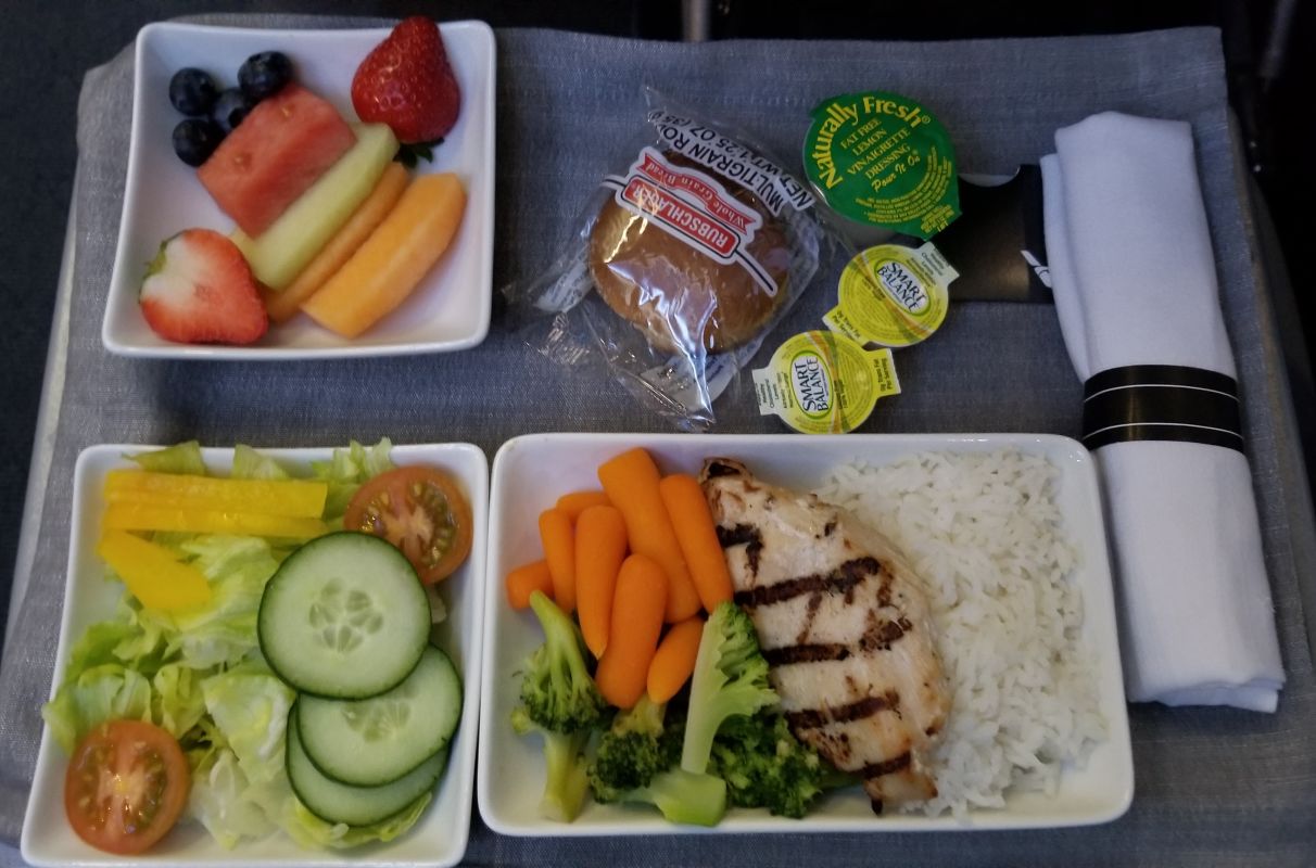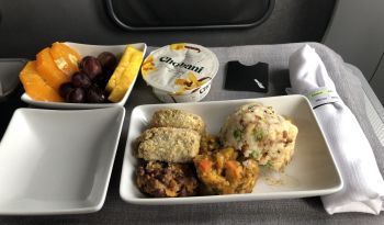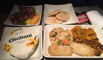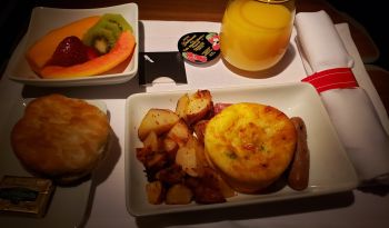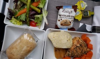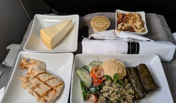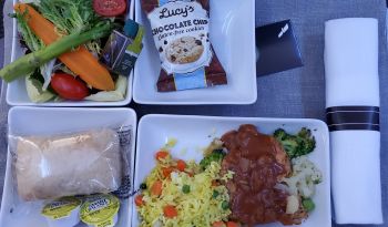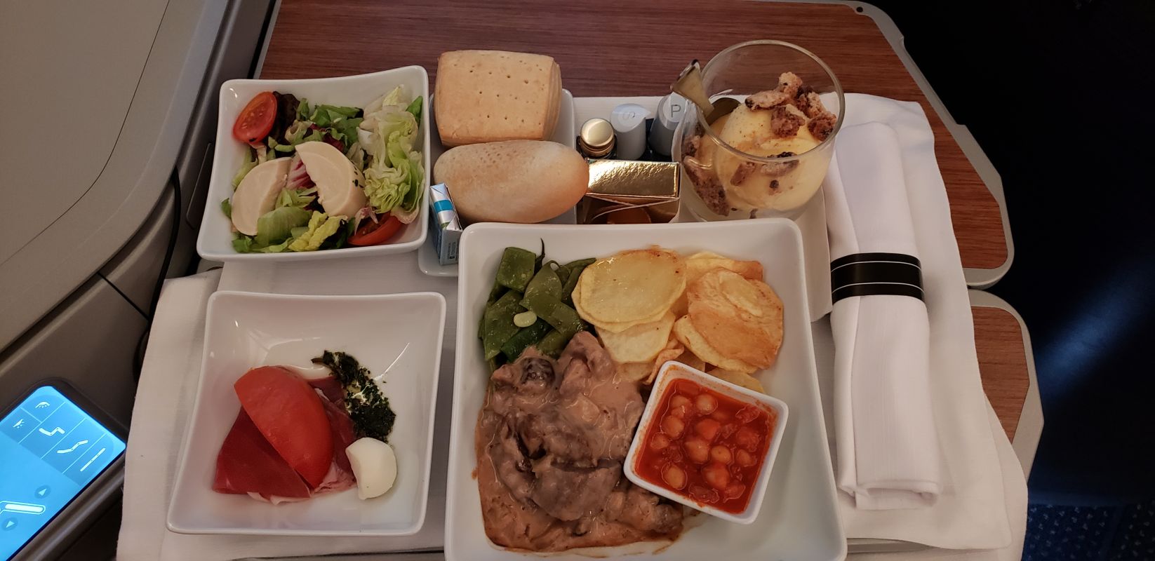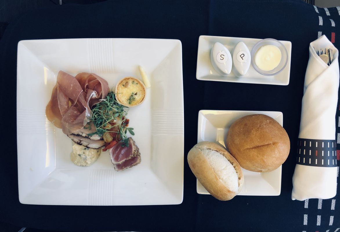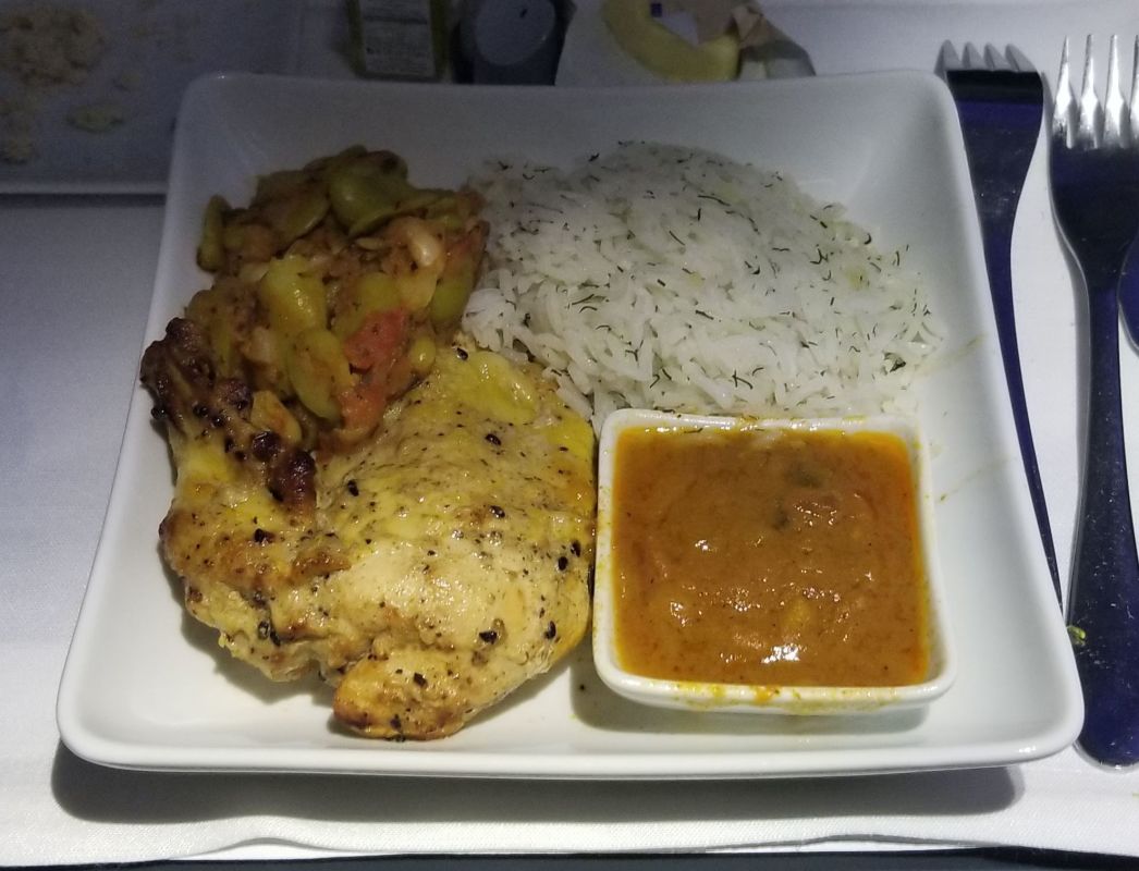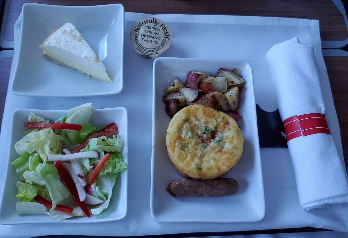 Porcini crusted filet mignon was amazing. By far the best meal I've had in the sky. Juicy and cooked medium.