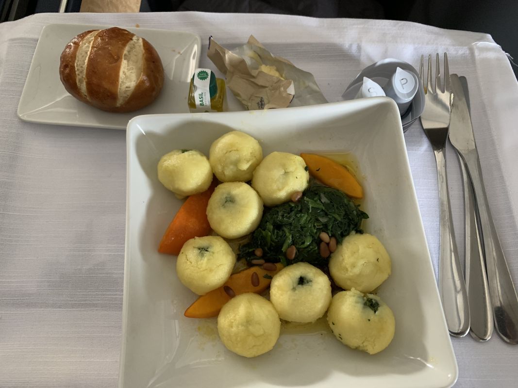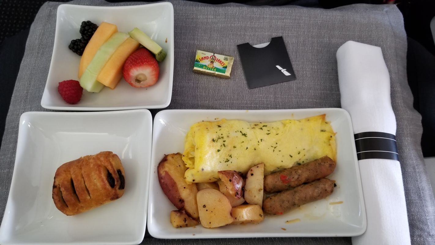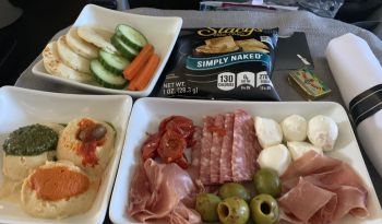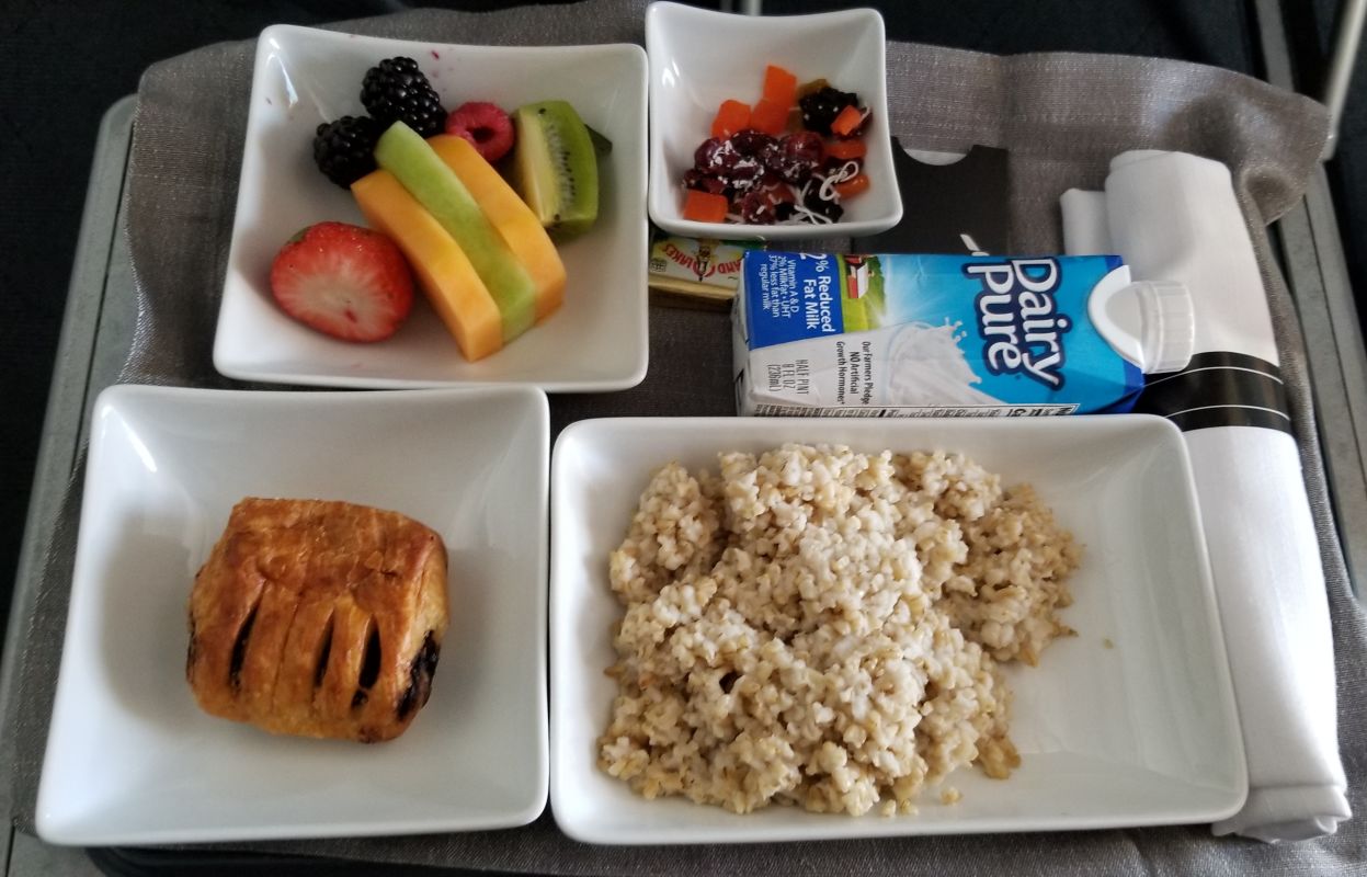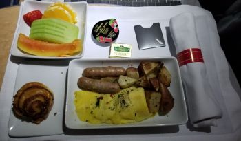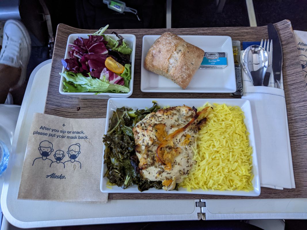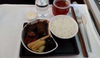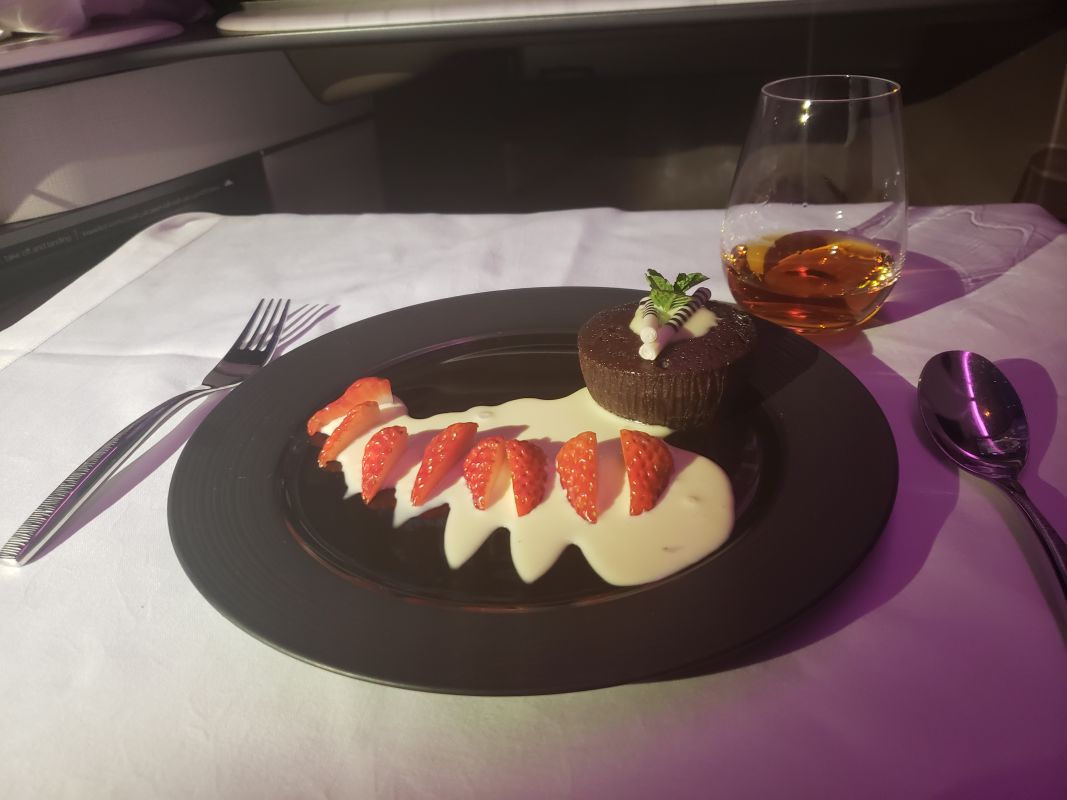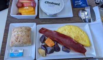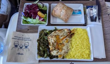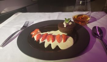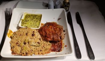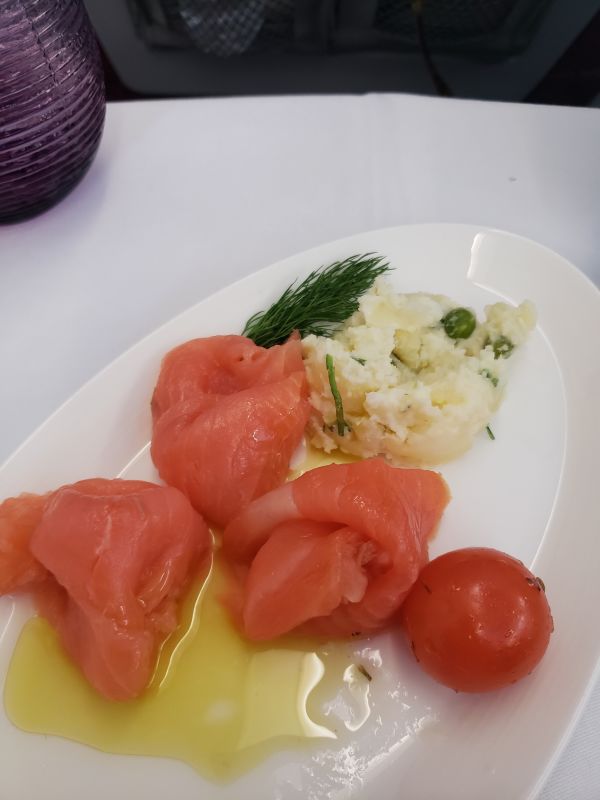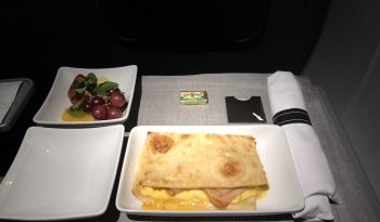 Porcini crusted filet mignon was amazing. By far the best meal I've had in the sky. Juicy and cooked medium.