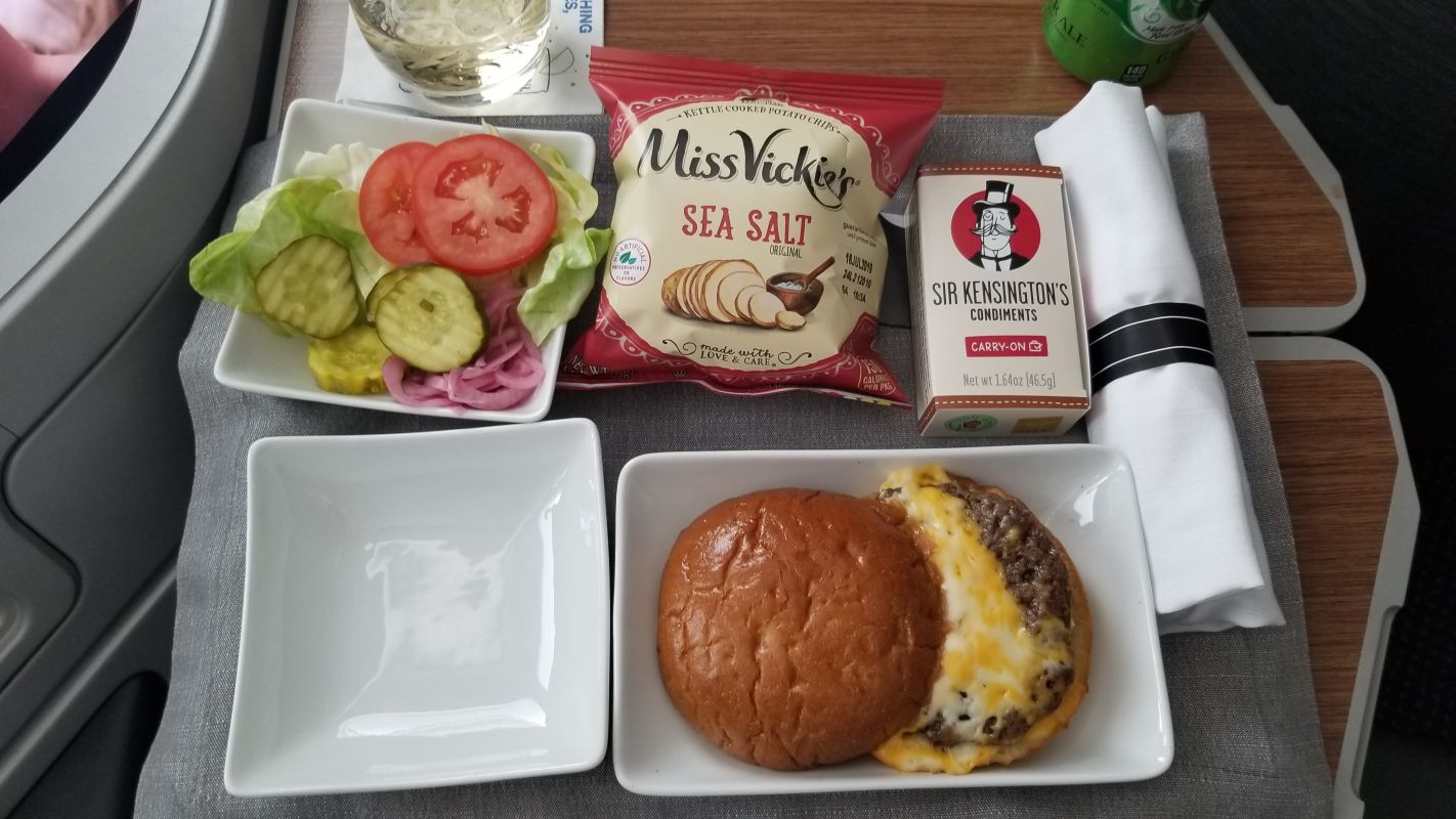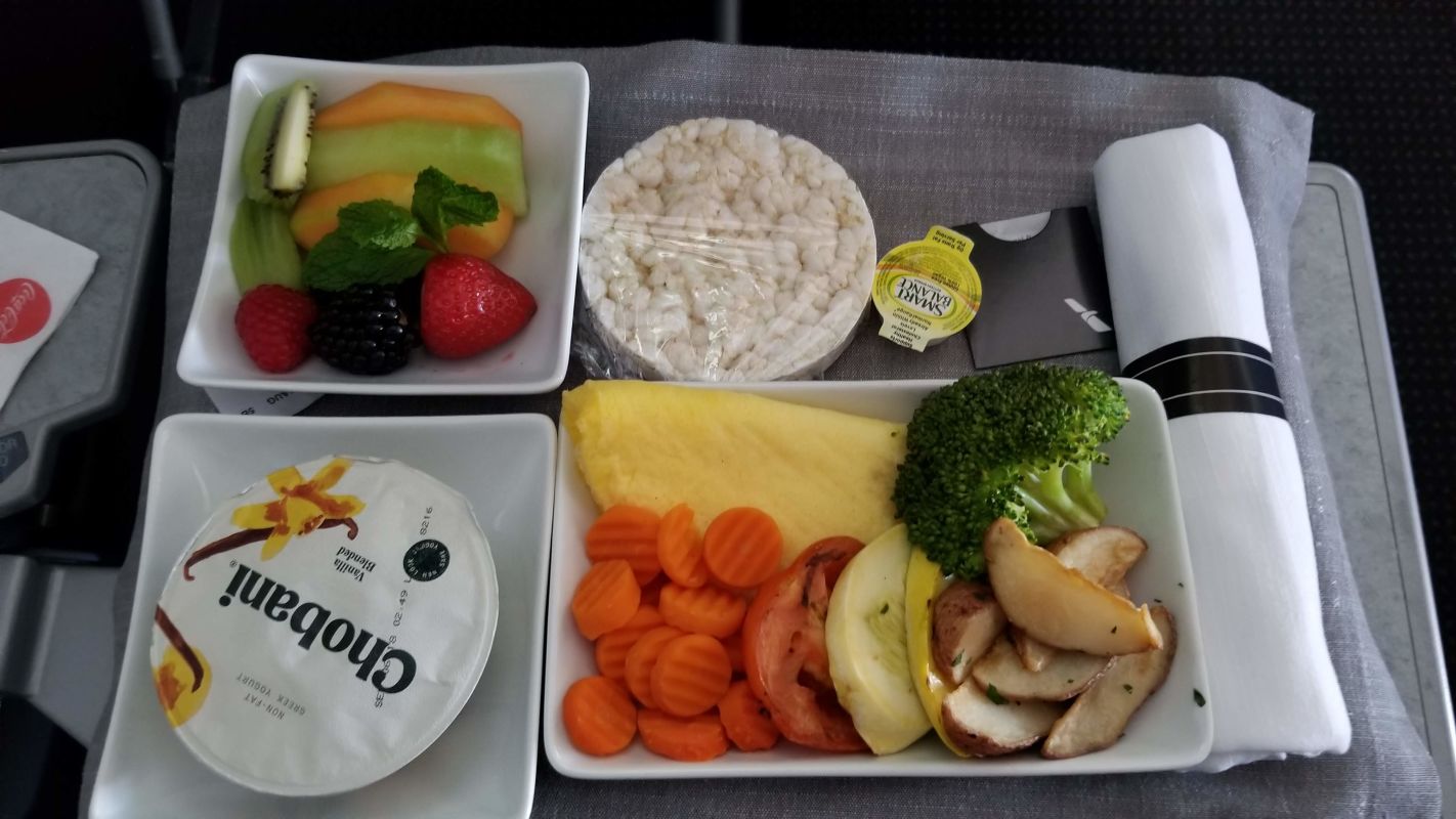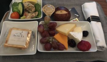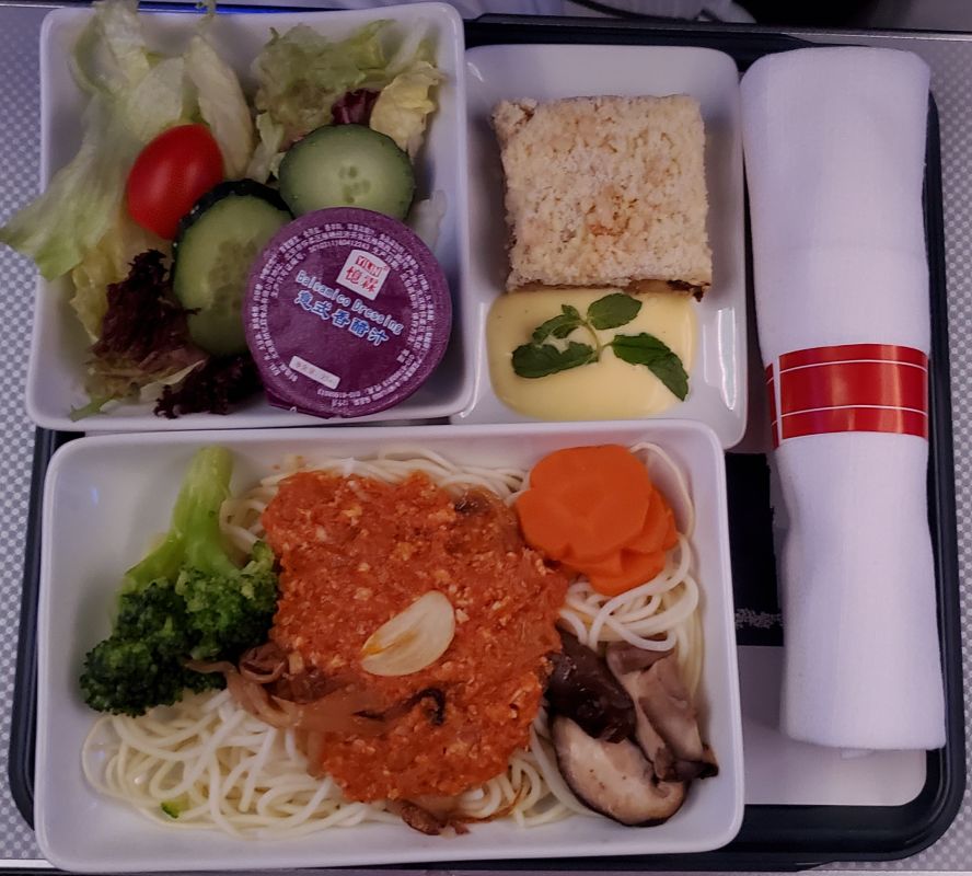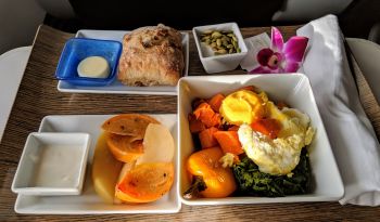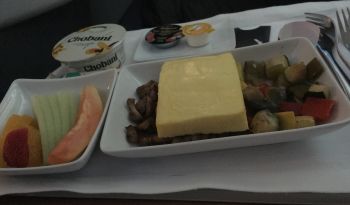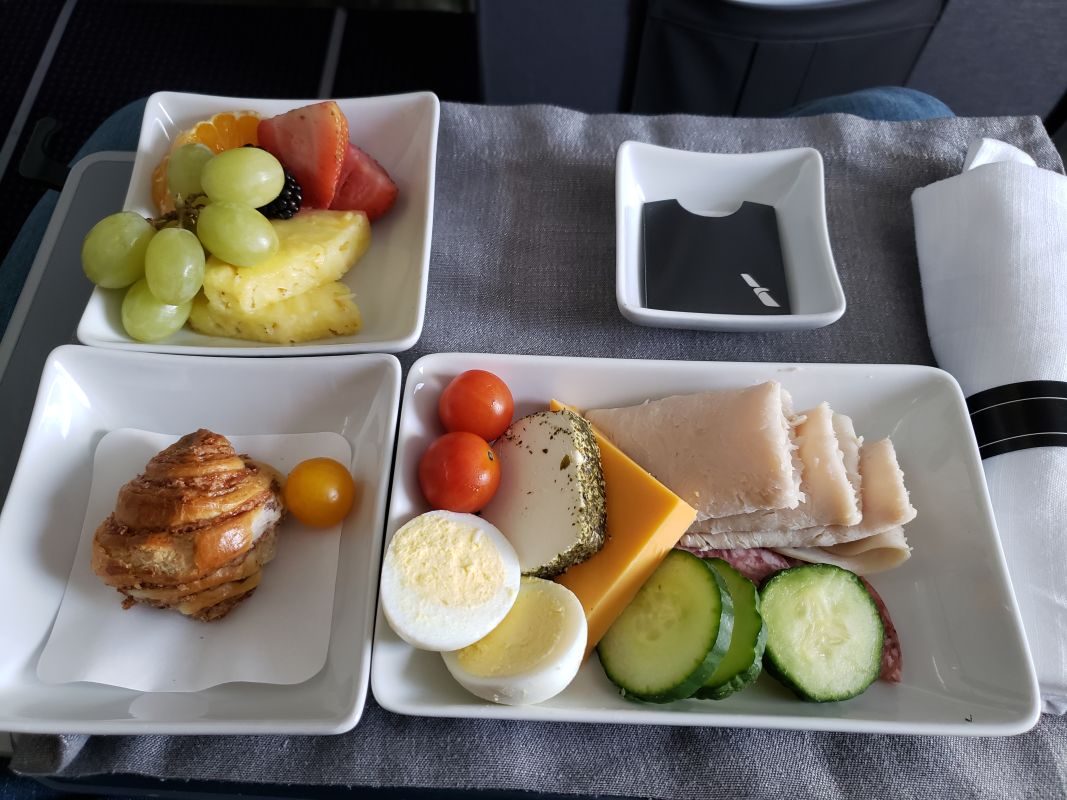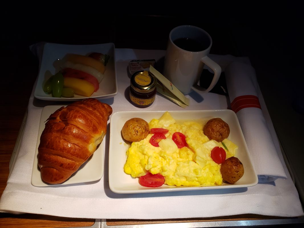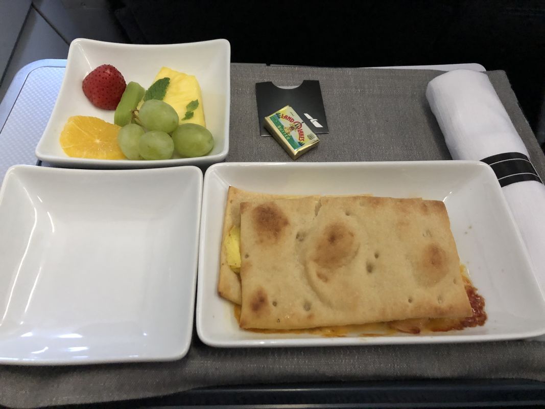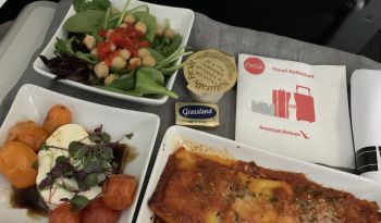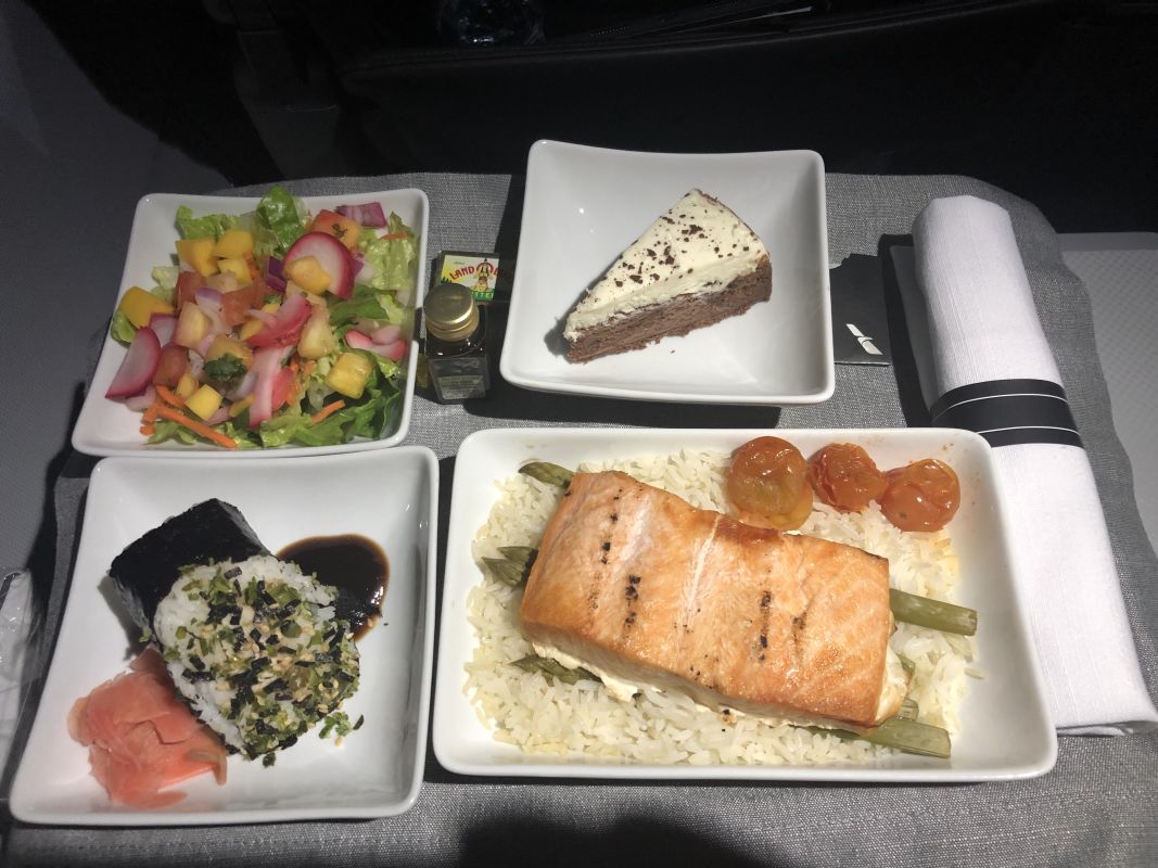 Porcini crusted filet mignon was amazing. By far the best meal I've had in the sky. Juicy and cooked medium.