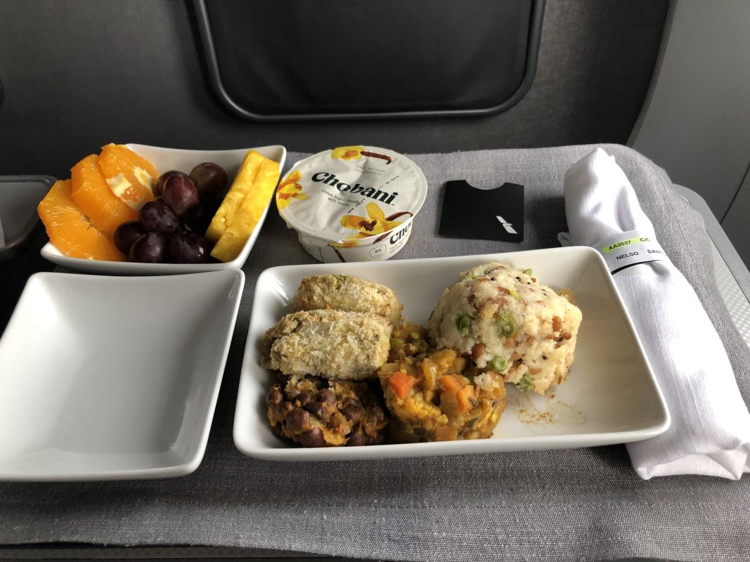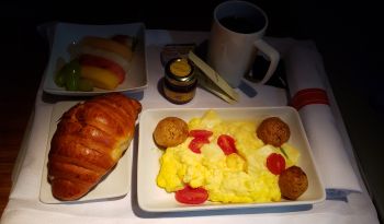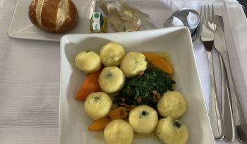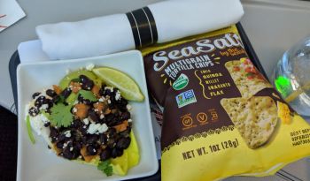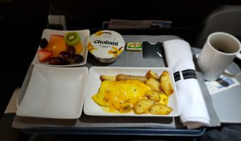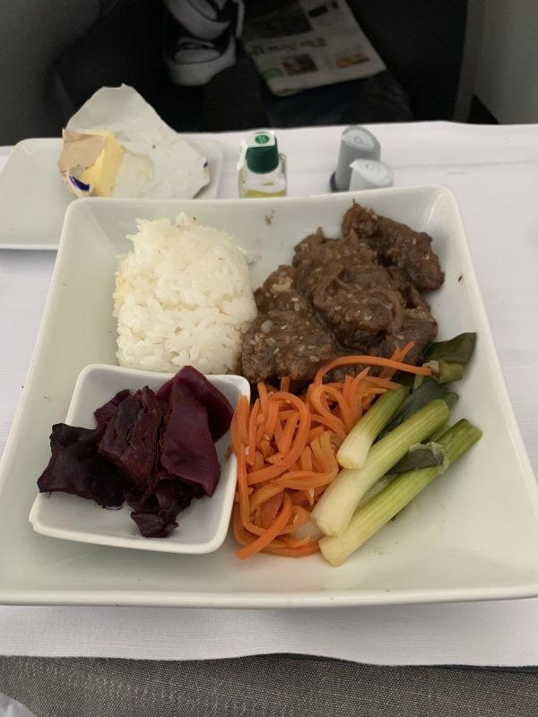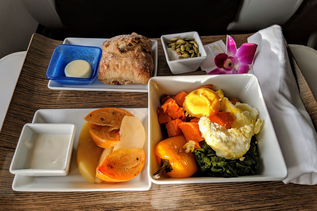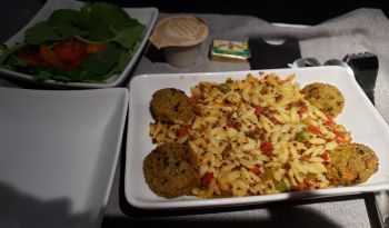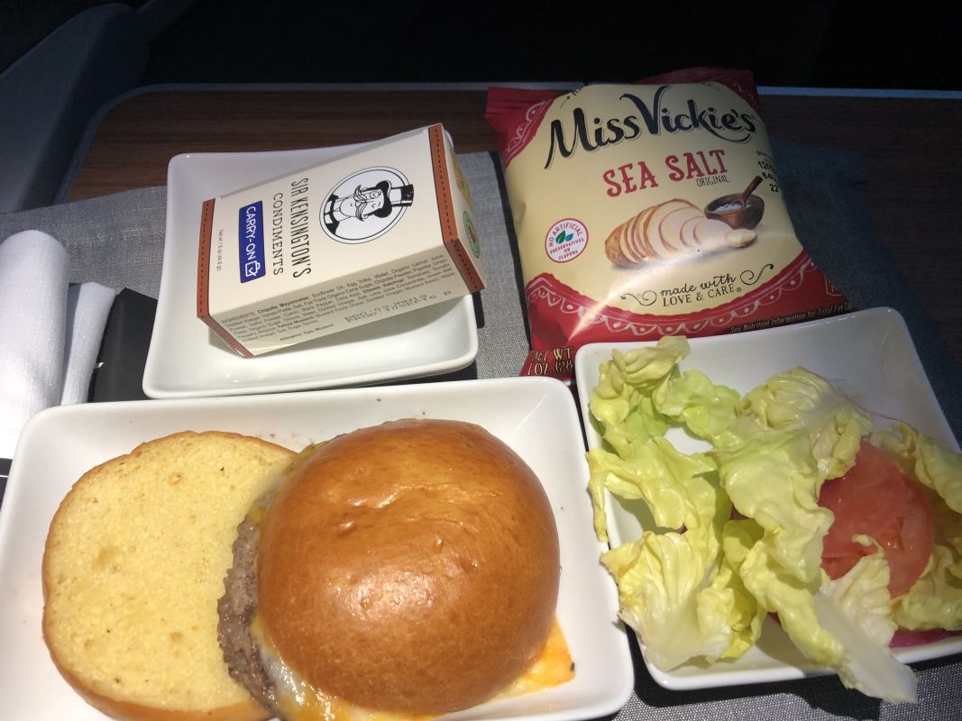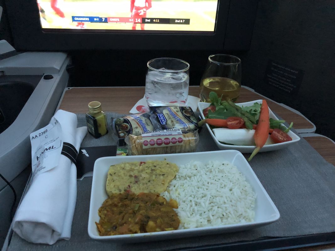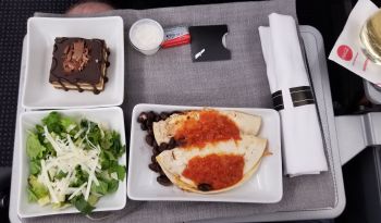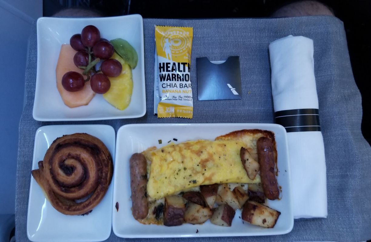 Porcini crusted filet mignon was amazing. By far the best meal I've had in the sky. Juicy and cooked medium.