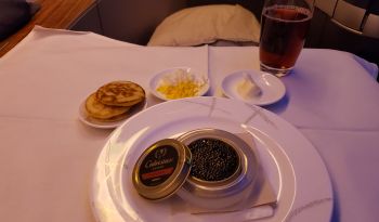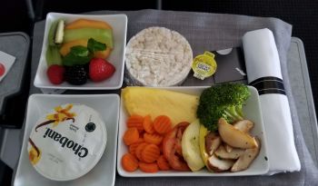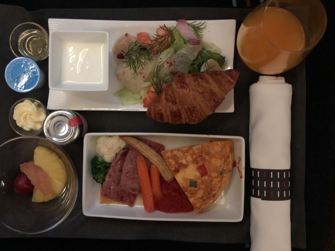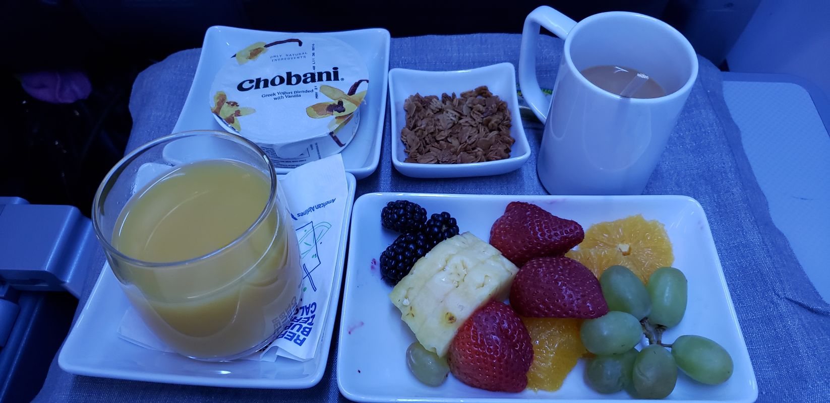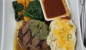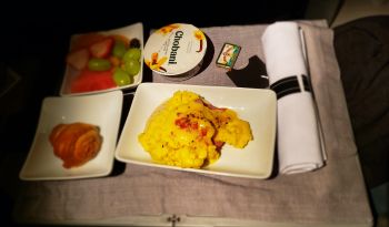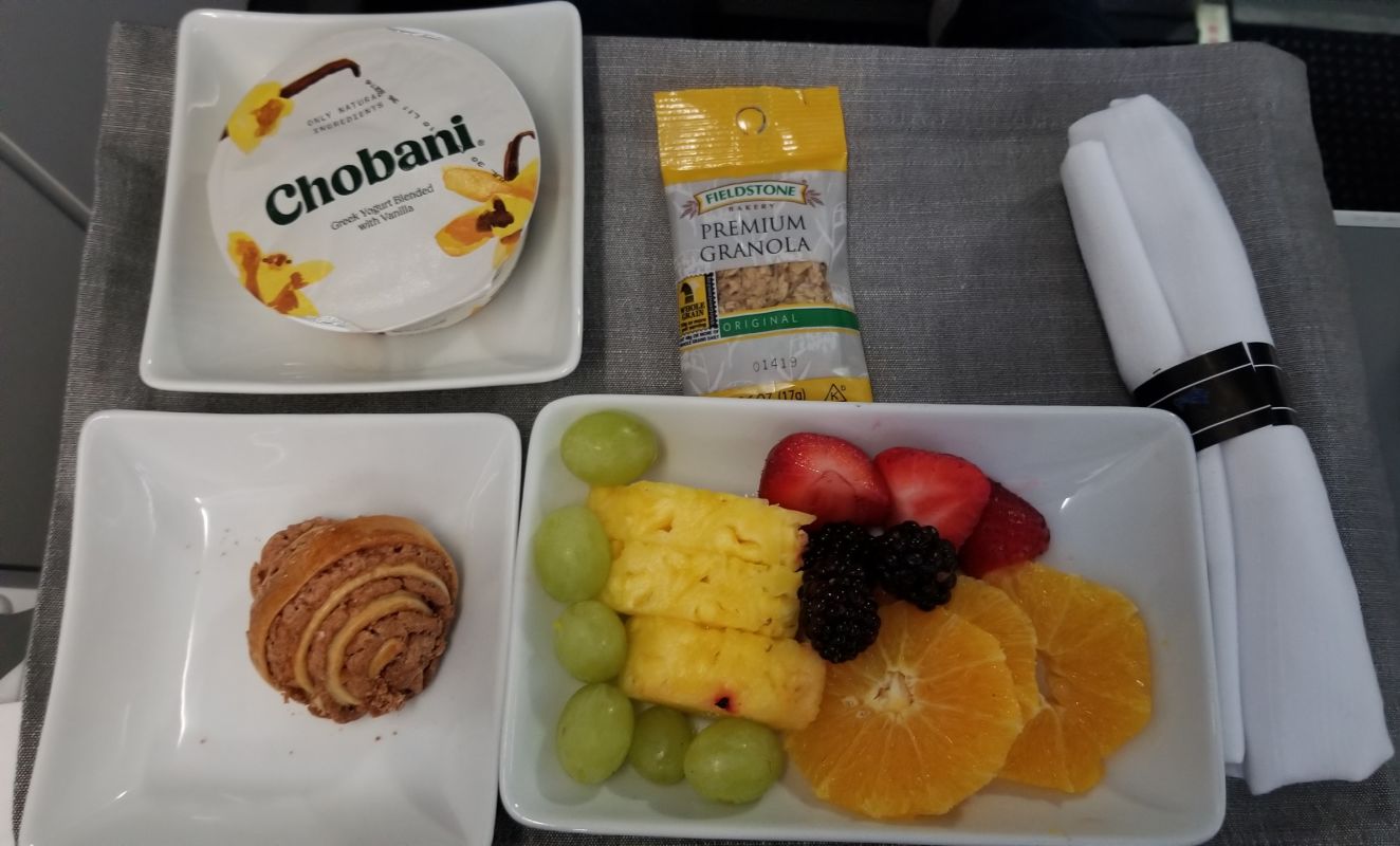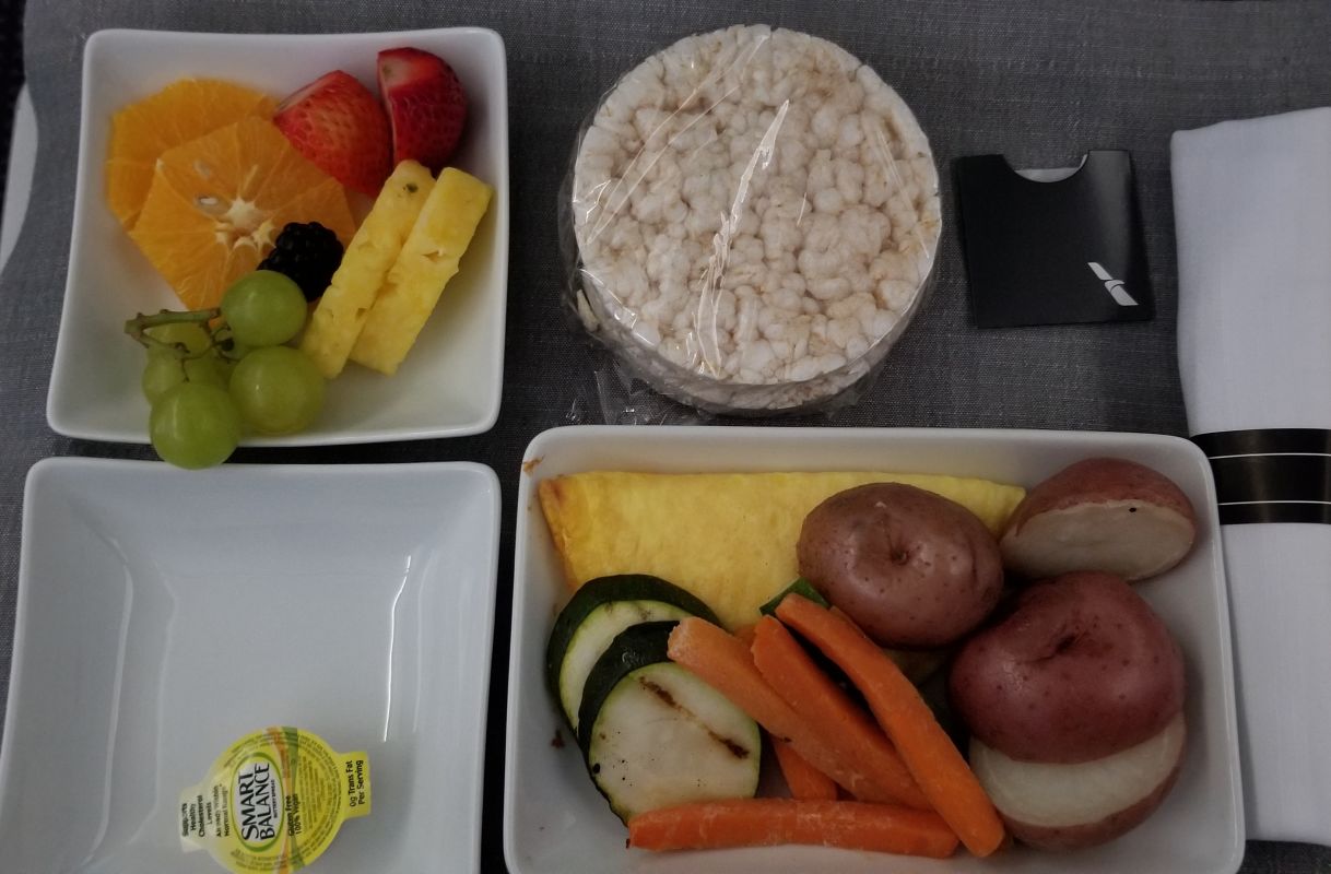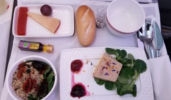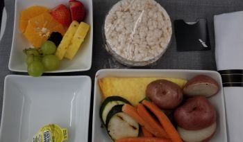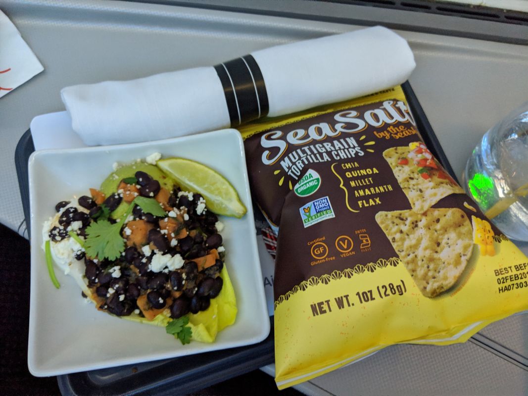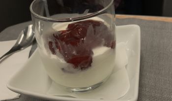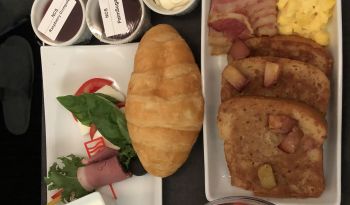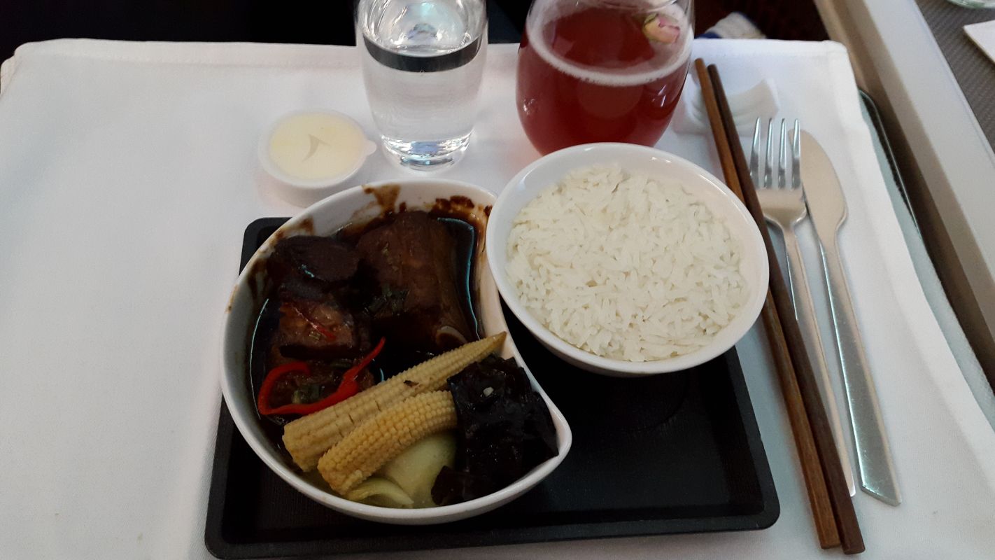 Porcini crusted filet mignon was amazing. By far the best meal I've had in the sky. Juicy and cooked medium.
