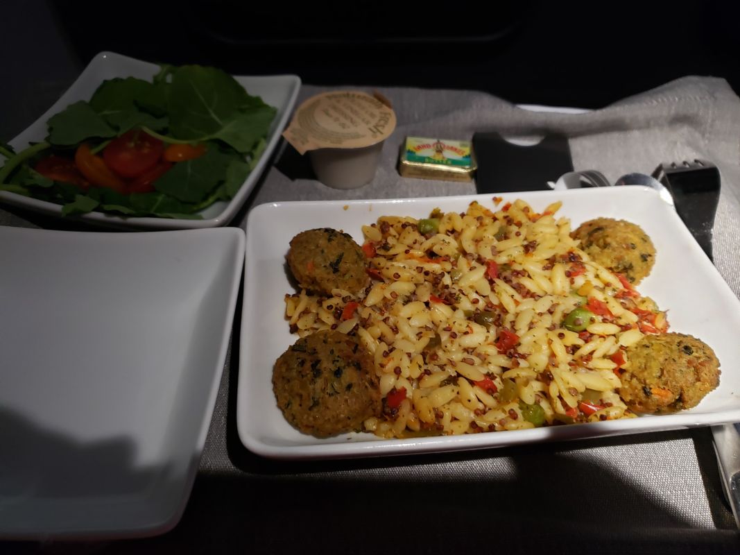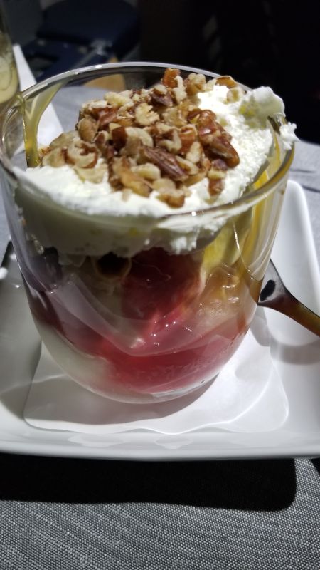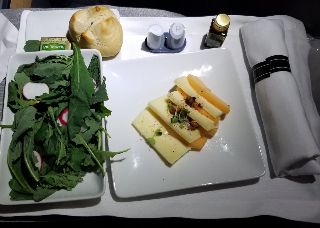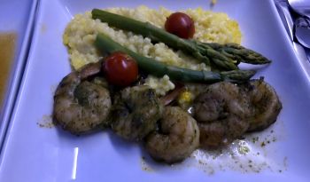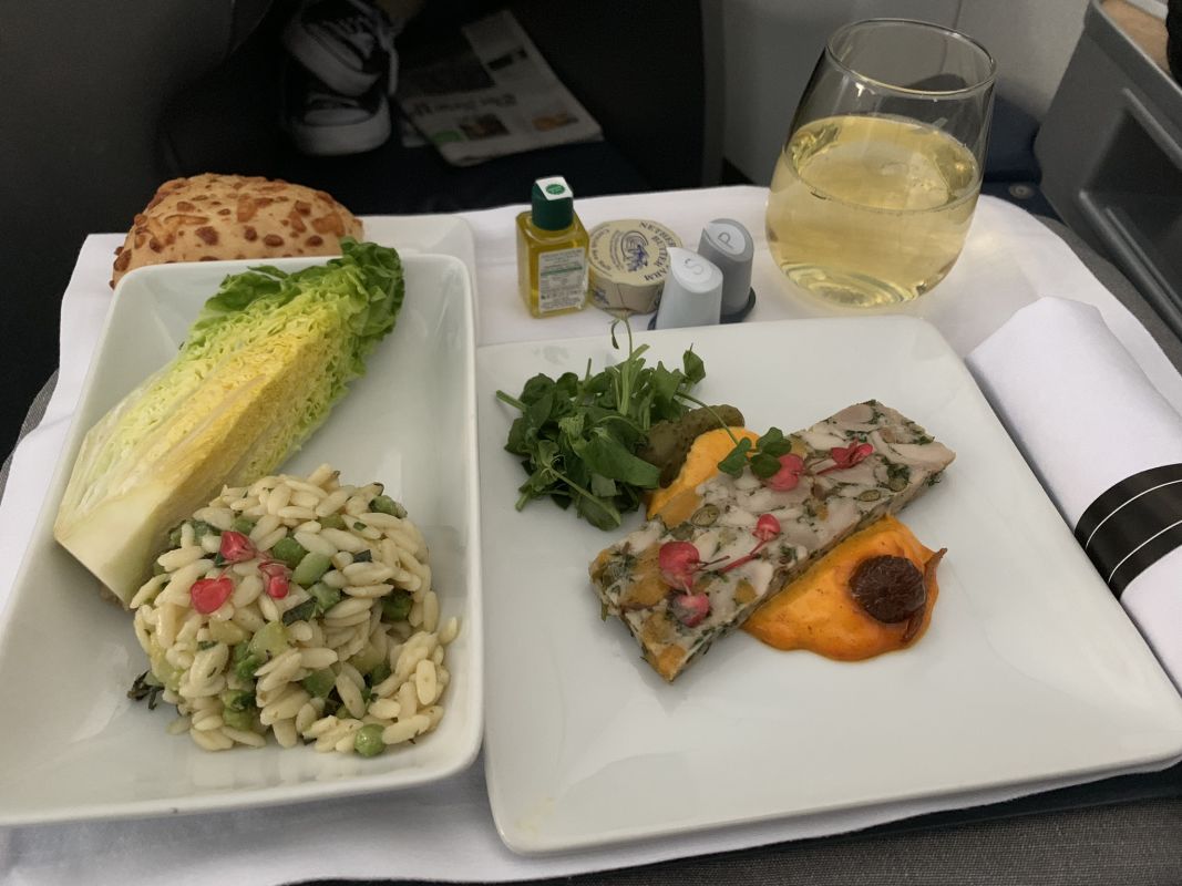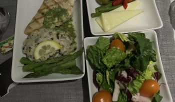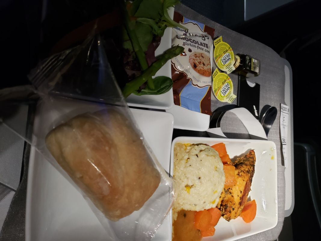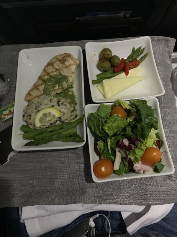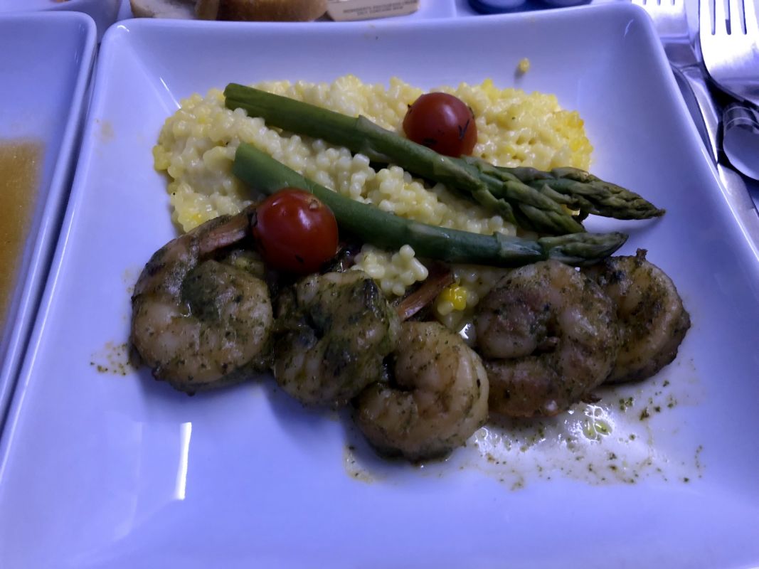 Pesto grilled shrimp with saffron pecorino risotto. A great light dish for a 1am PST (4am EST) departure. Sleep was my priority!