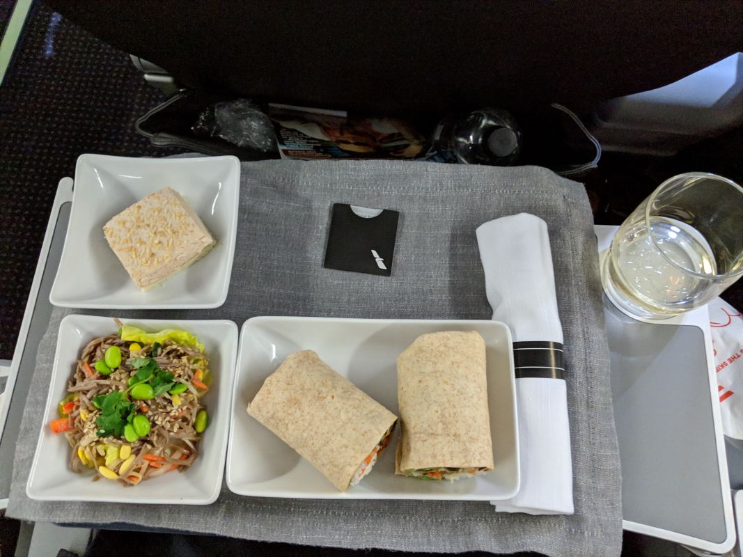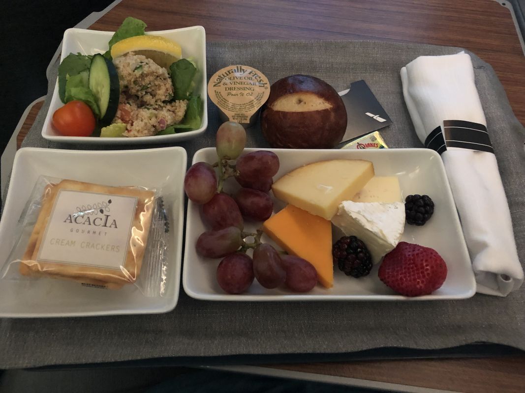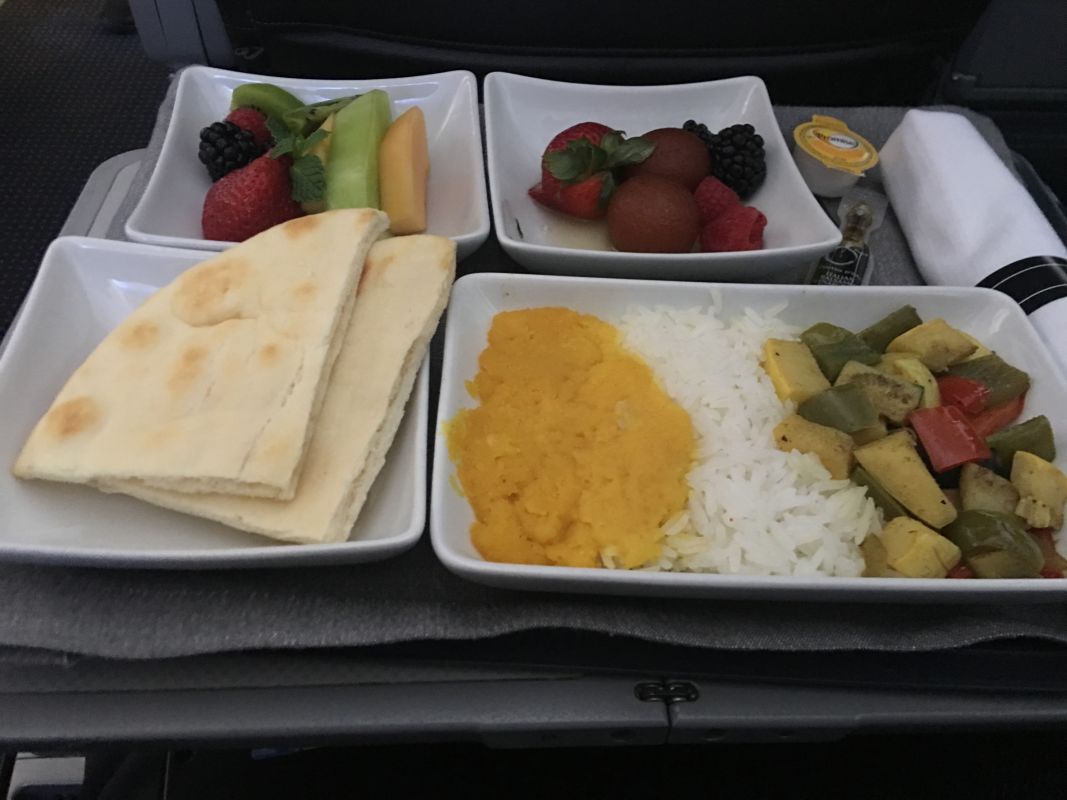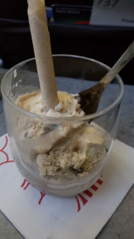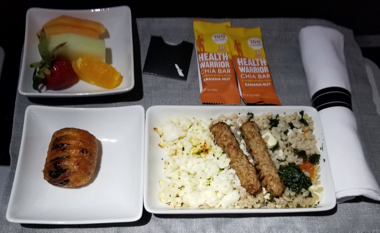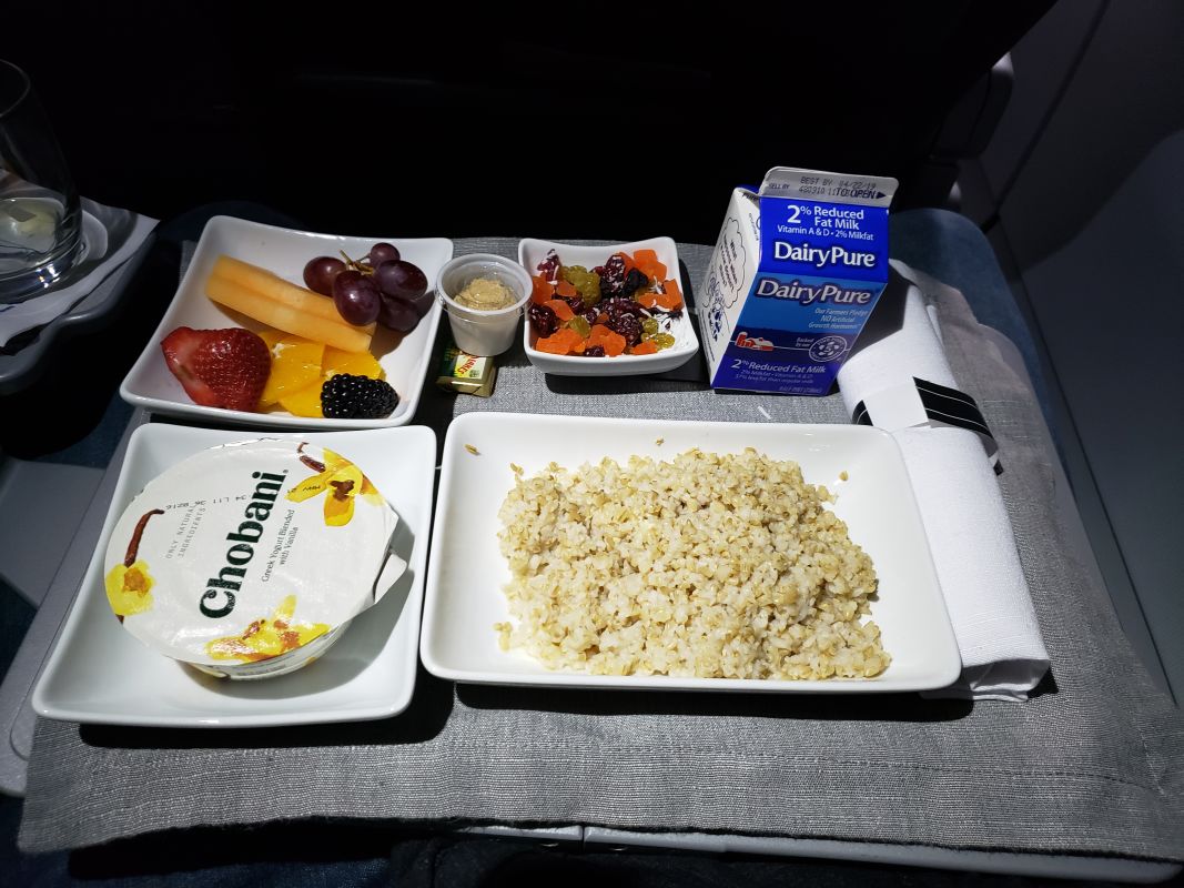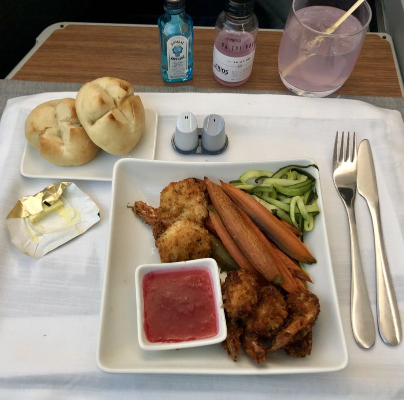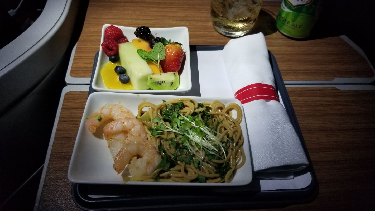 Pesto grilled shrimp with saffron pecorino risotto. A great light dish for a 1am PST (4am EST) departure. Sleep was my priority!