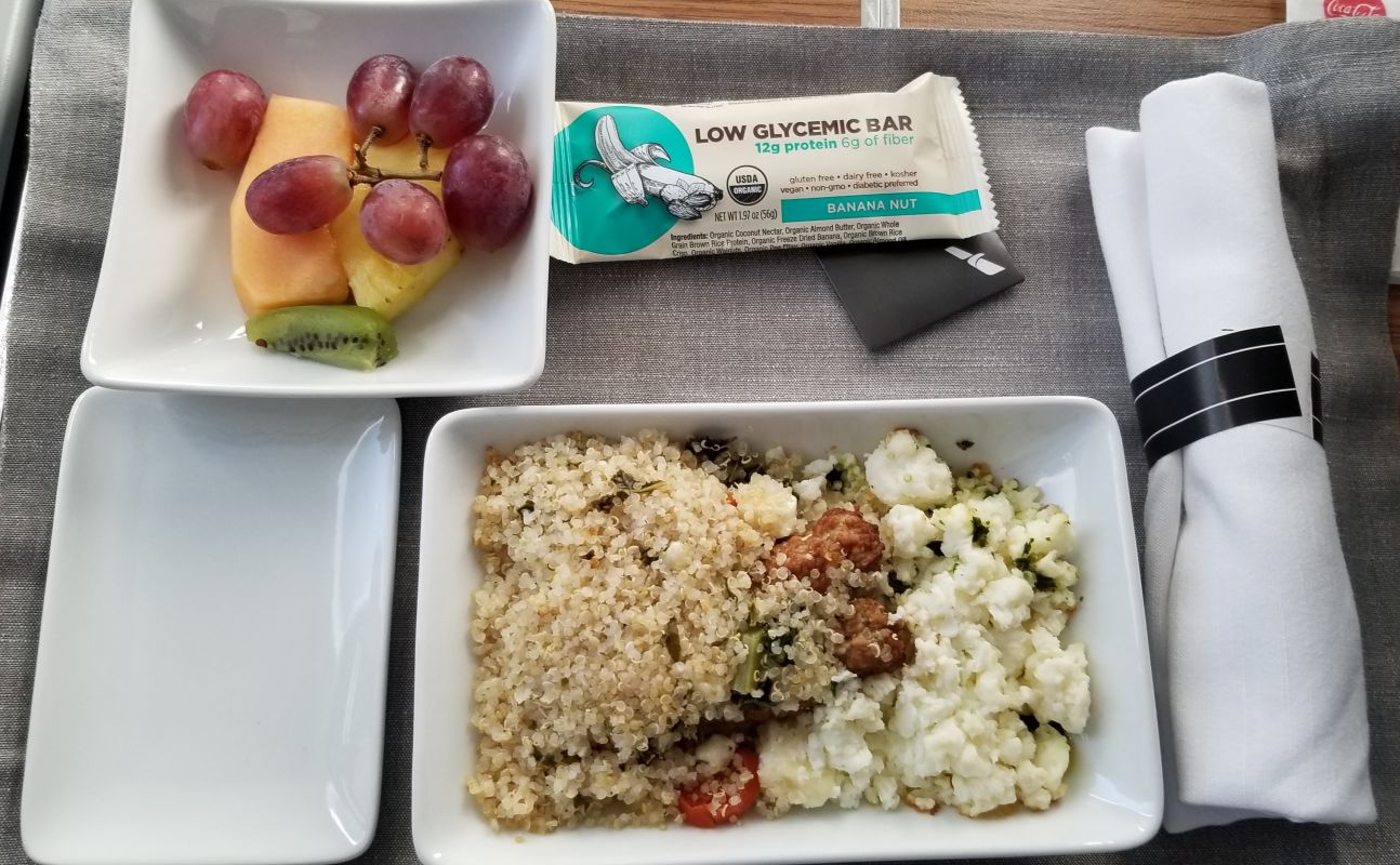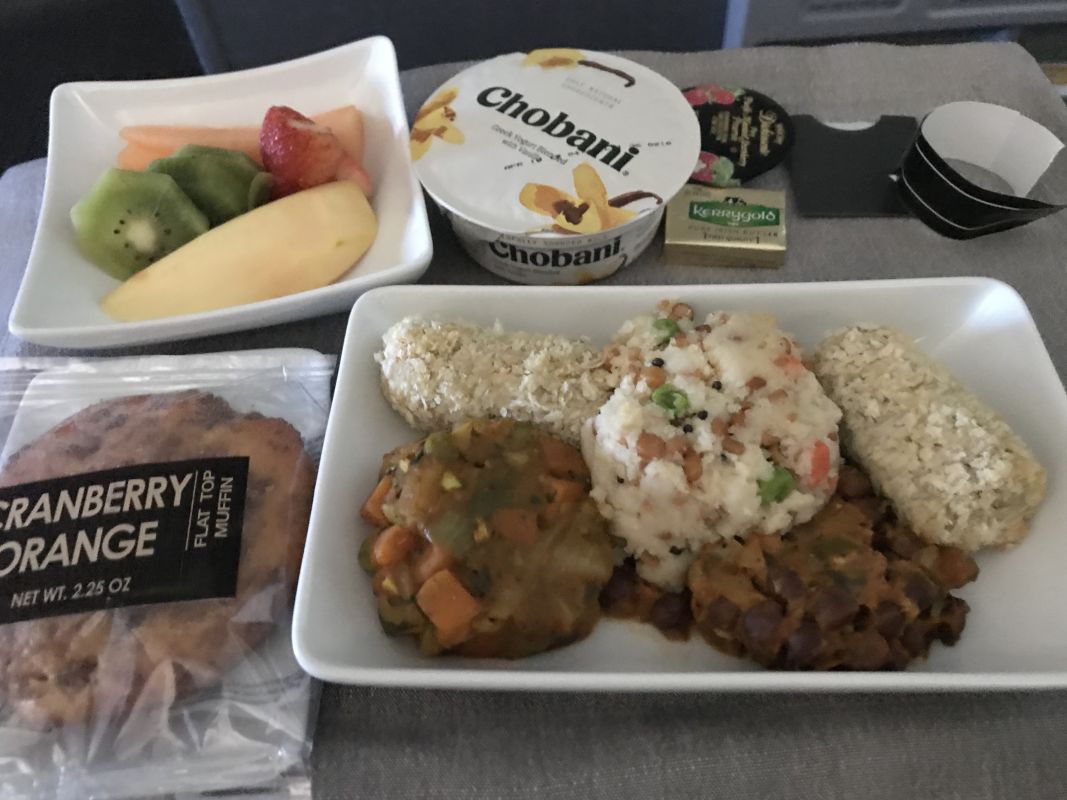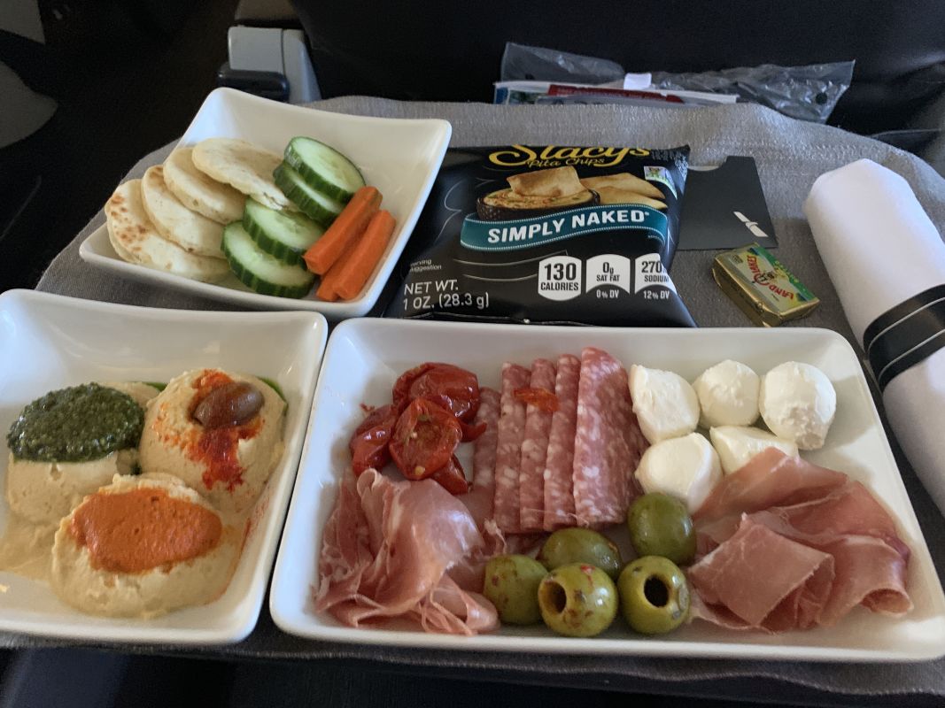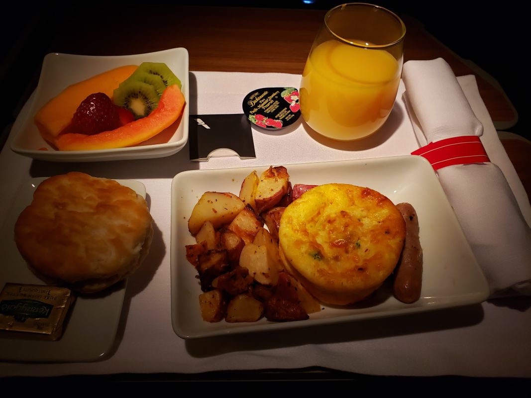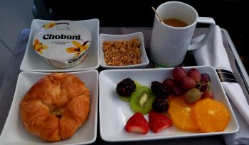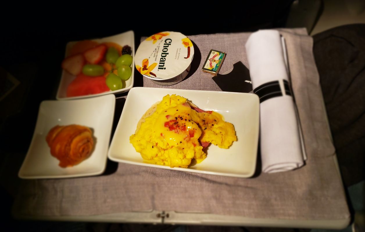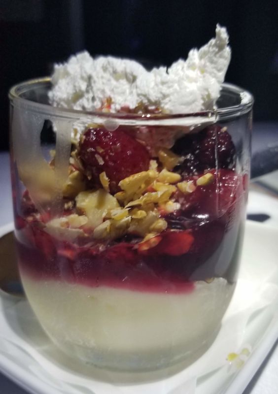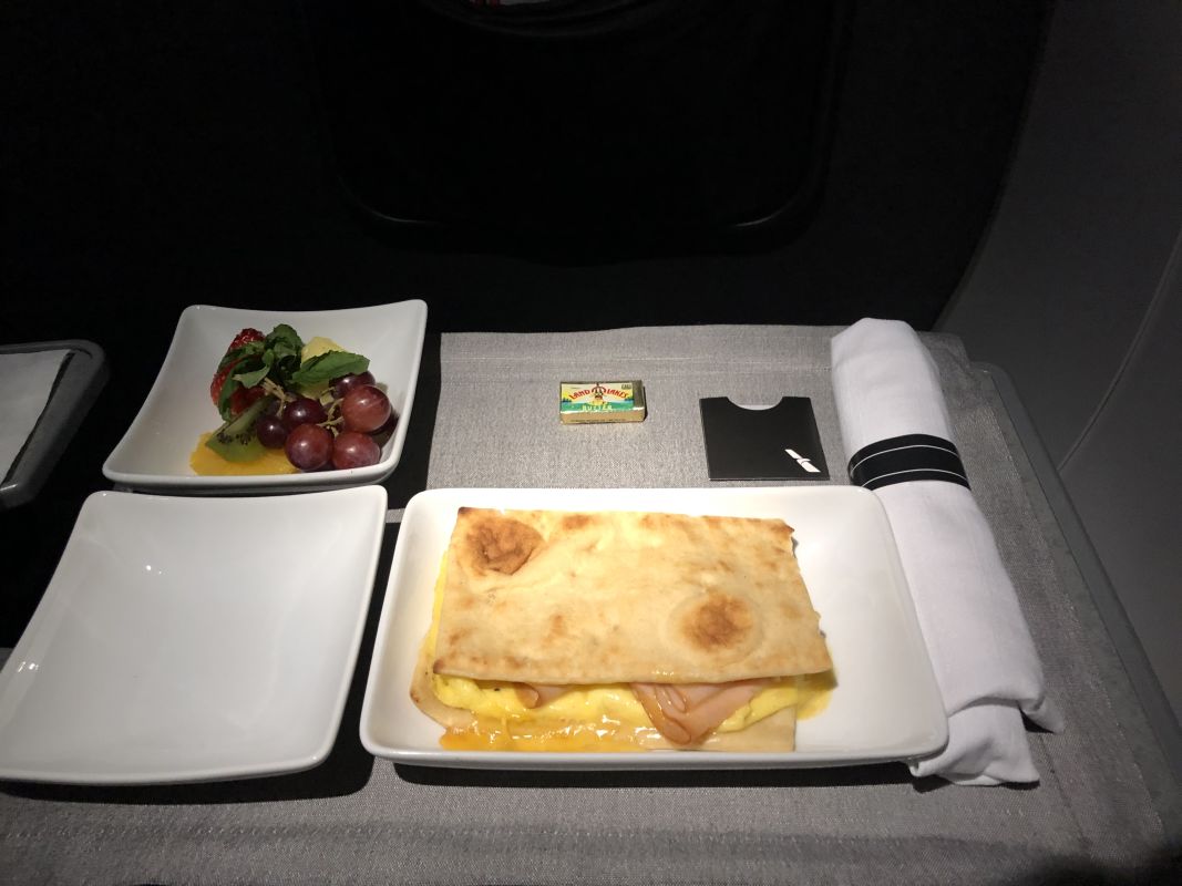 Pesto grilled shrimp with saffron pecorino risotto. A great light dish for a 1am PST (4am EST) departure. Sleep was my priority!