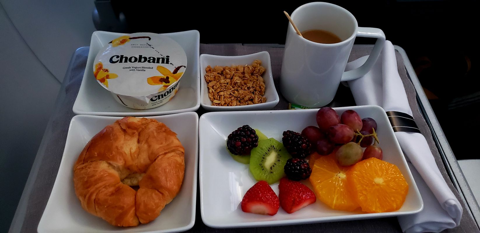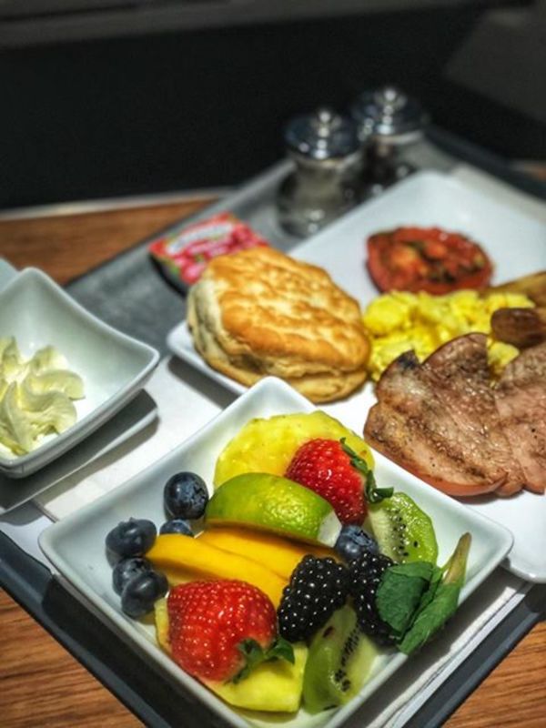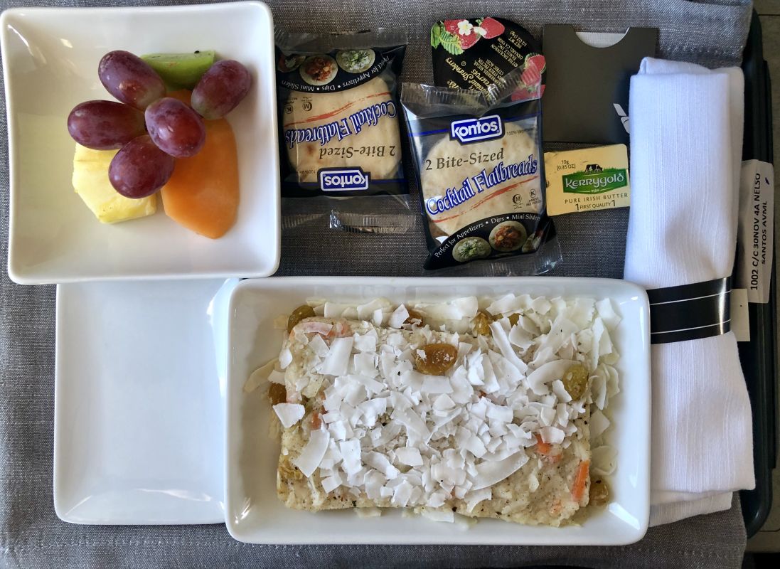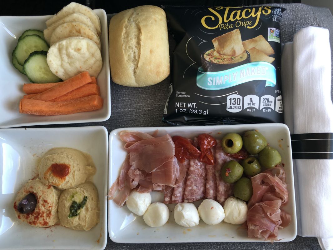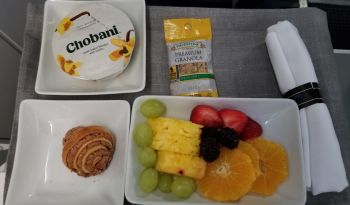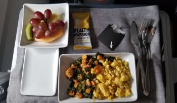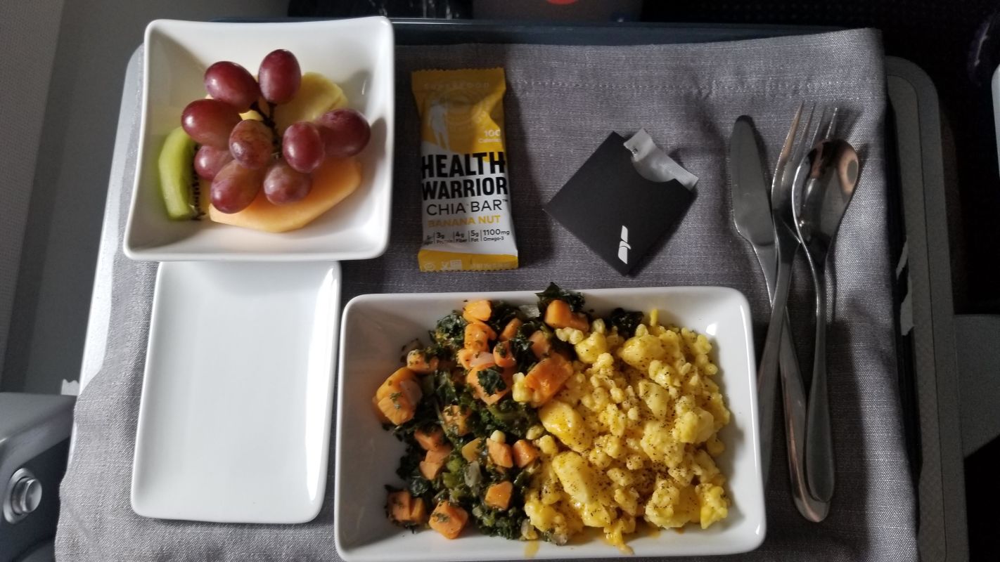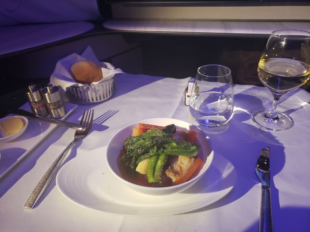 Pesto grilled shrimp with saffron pecorino risotto. A great light dish for a 1am PST (4am EST) departure. Sleep was my priority!