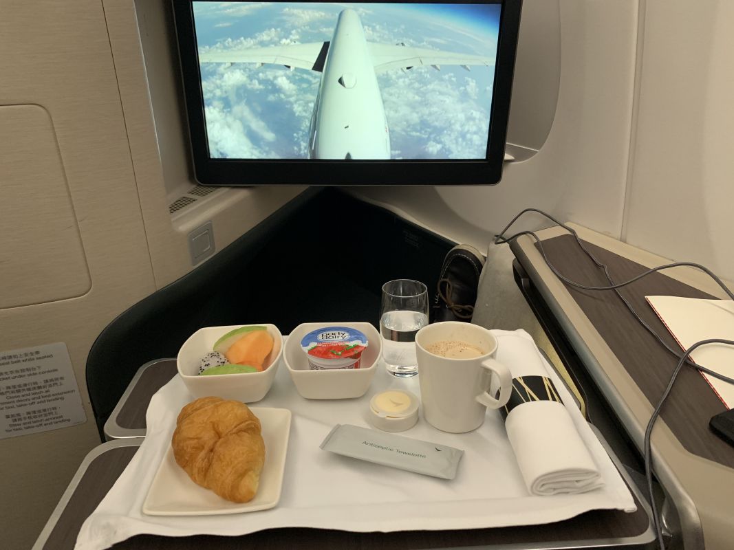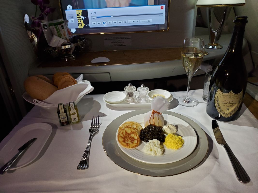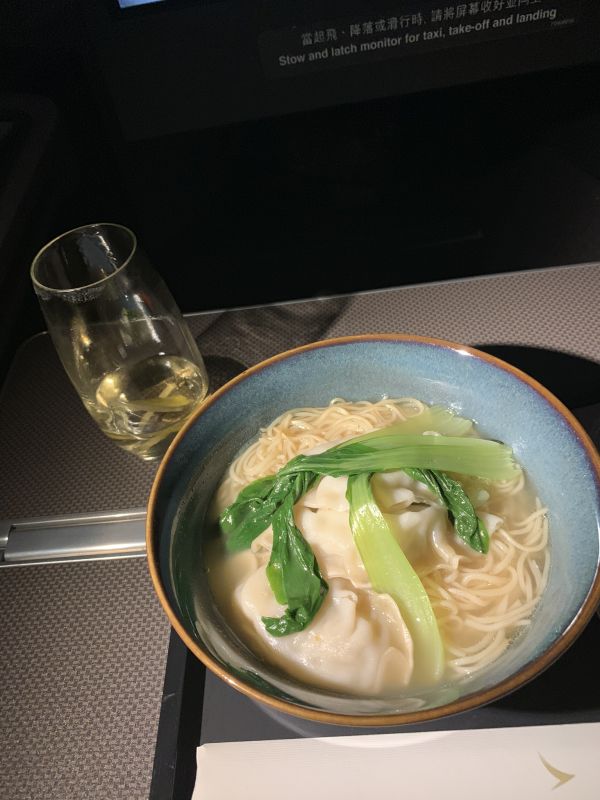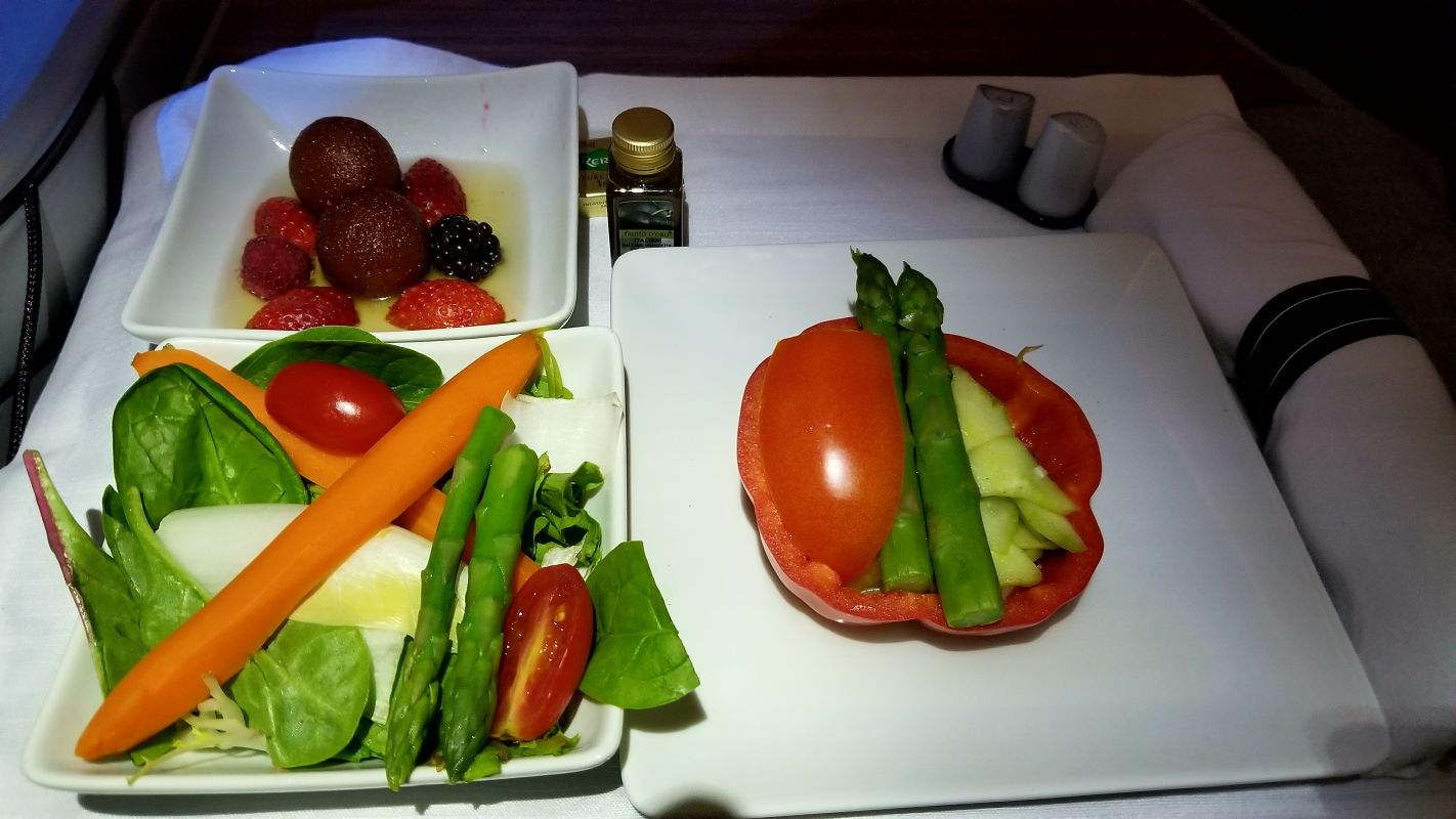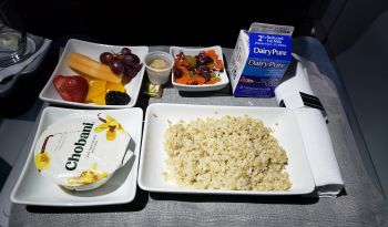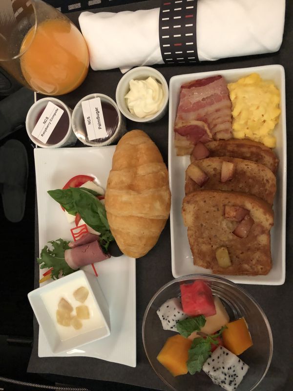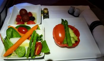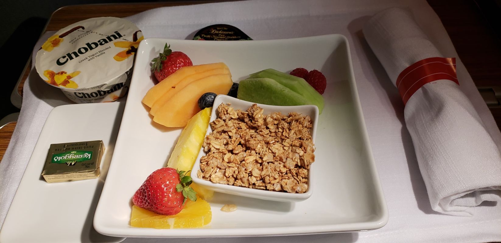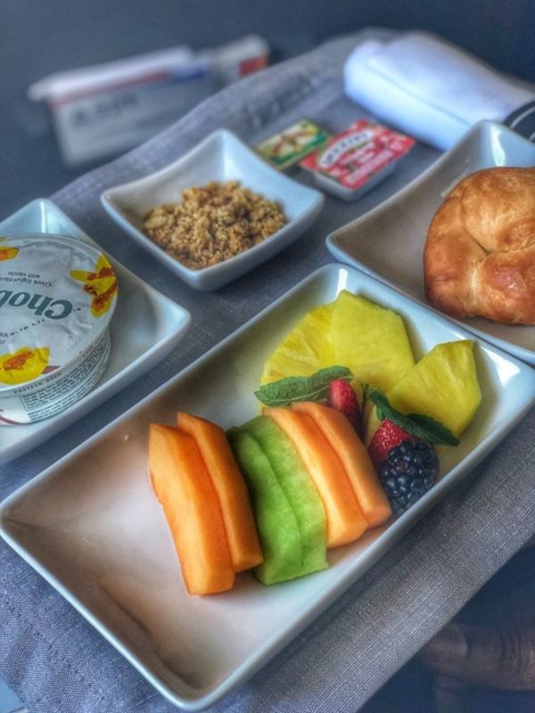 Pesto grilled shrimp with saffron pecorino risotto. A great light dish for a 1am PST (4am EST) departure. Sleep was my priority!