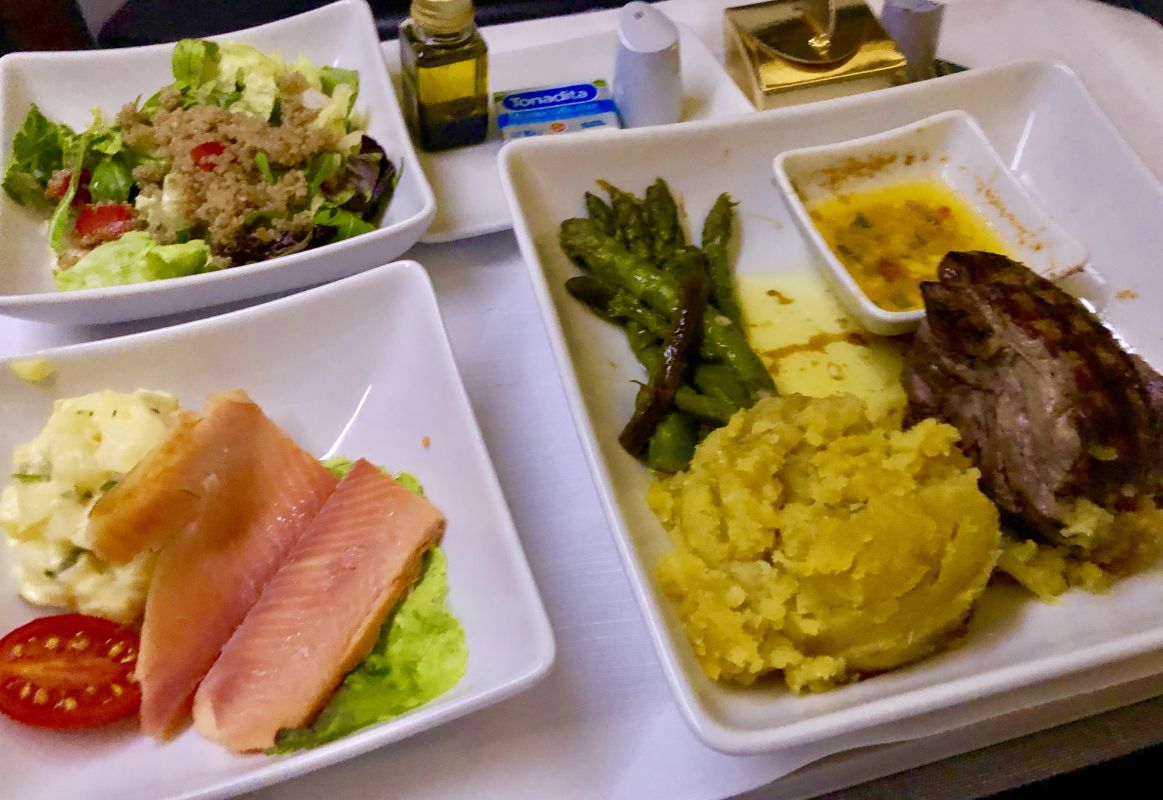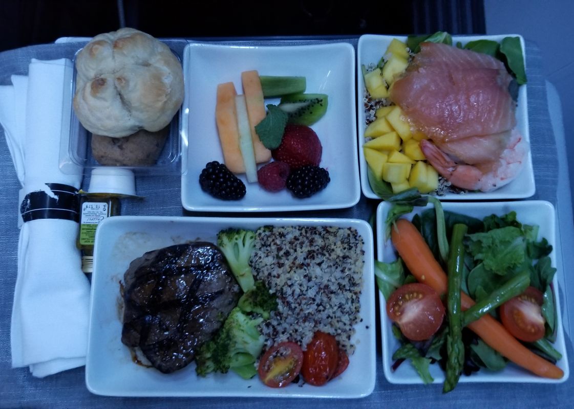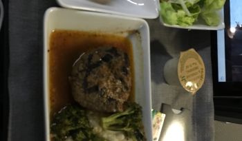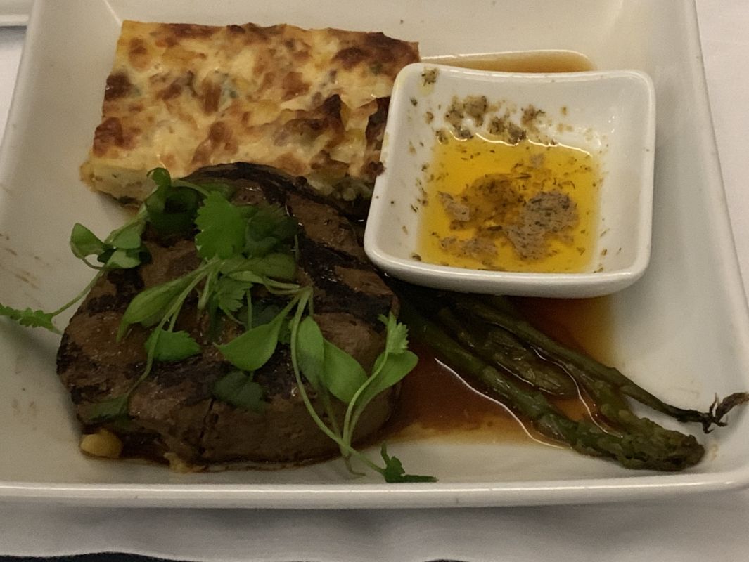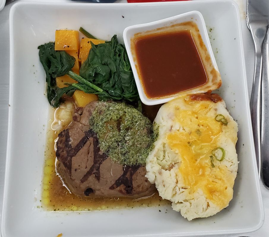 Beef Tenderloin Madeira sauce. Whole grain mustard artichoke salsa. Swiss chard. BEST STEAK I’ve ever had on a plane! Restaurant quality.