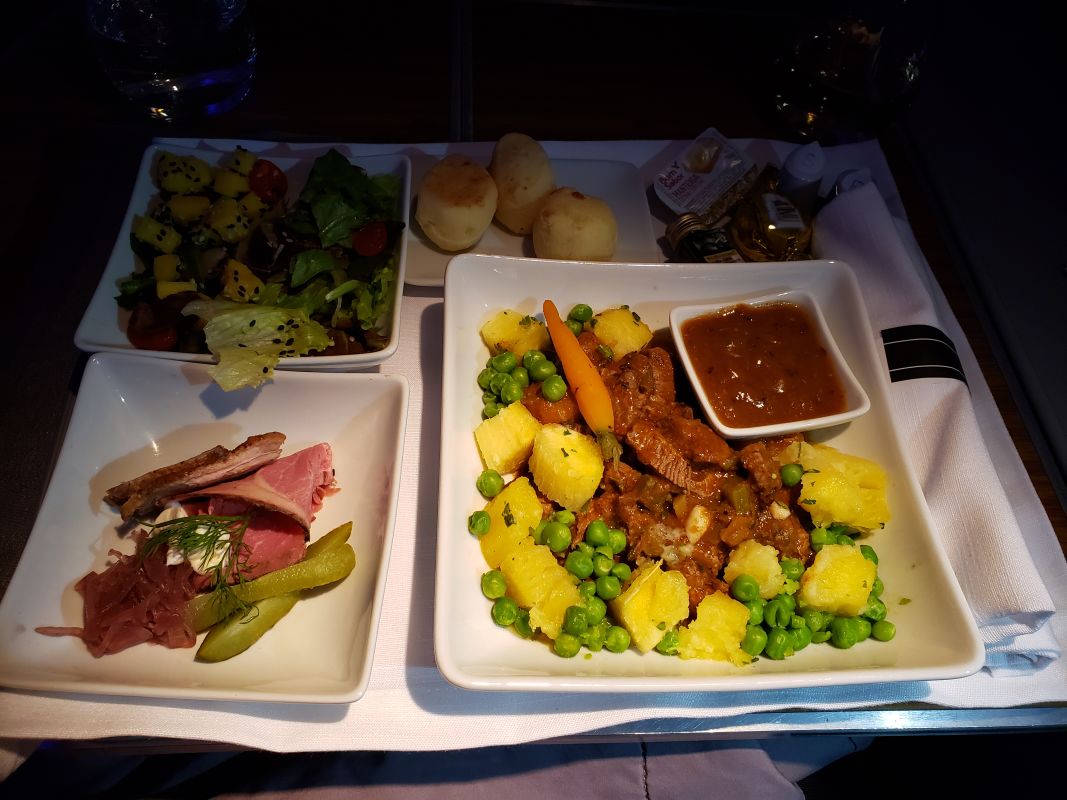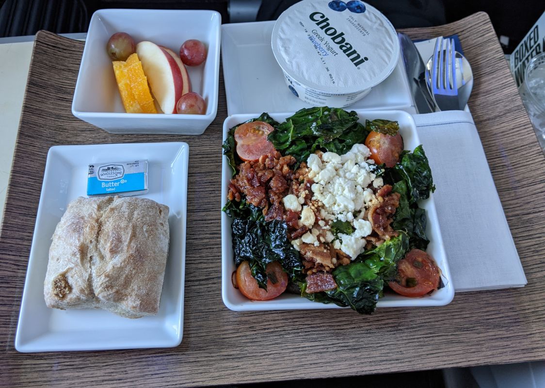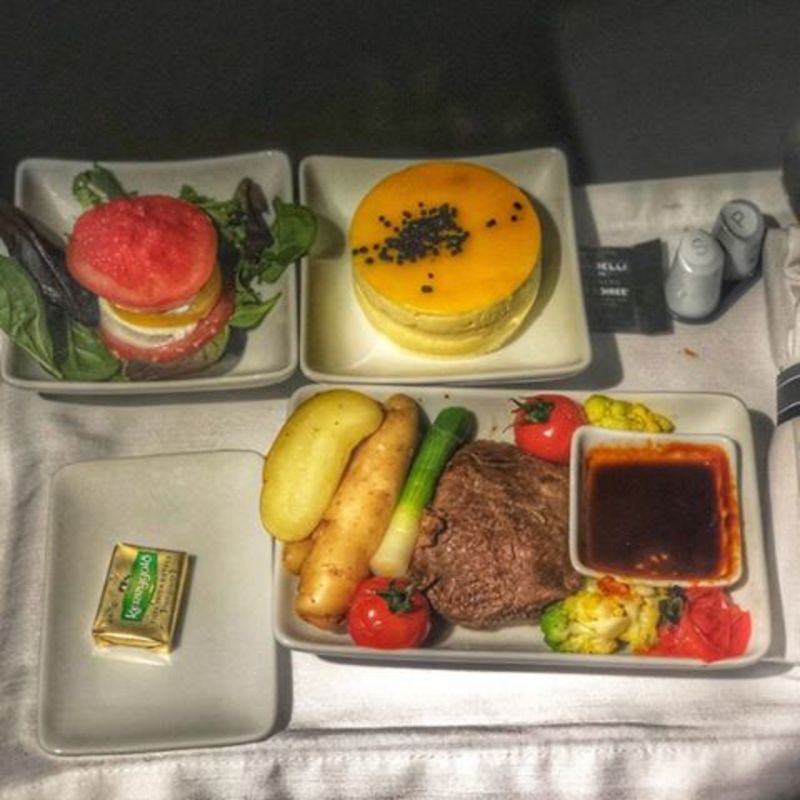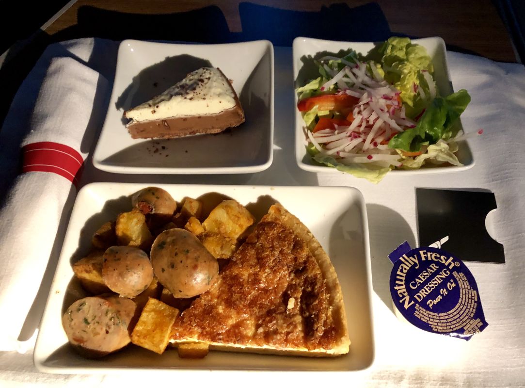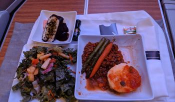 Beef Tenderloin Madeira sauce. Whole grain mustard artichoke salsa. Swiss chard. BEST STEAK I’ve ever had on a plane! Restaurant quality.
