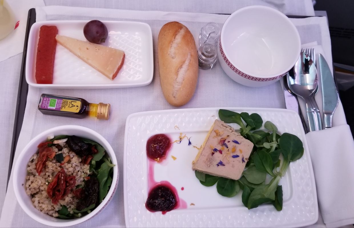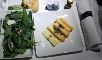 Lunch starter: warm bread and extra virgin olive oil, quinoa and kale salad with sundried tomatoes, Pedro Ximenez balsamic vinegar, duck foi-gras terrine served with cranberry jam and lamb lettuce, & cured cheese with quince jelly and grapes