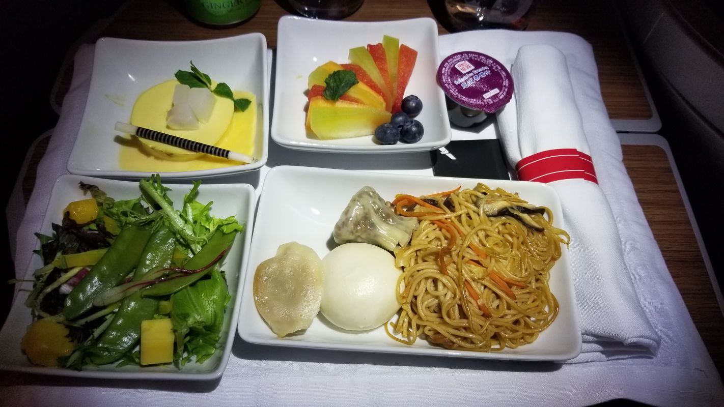 (1) Dim Sum with egg yolk, mushroom and glutinous shaomai, Shanghai noodles (2) Fresh Seasonal Greens with snow peas, mango and balsamic vinaigrette (3) Coconut Creme Brulee with saffron anglaise (light meal offered prior to arrival)