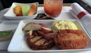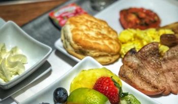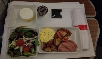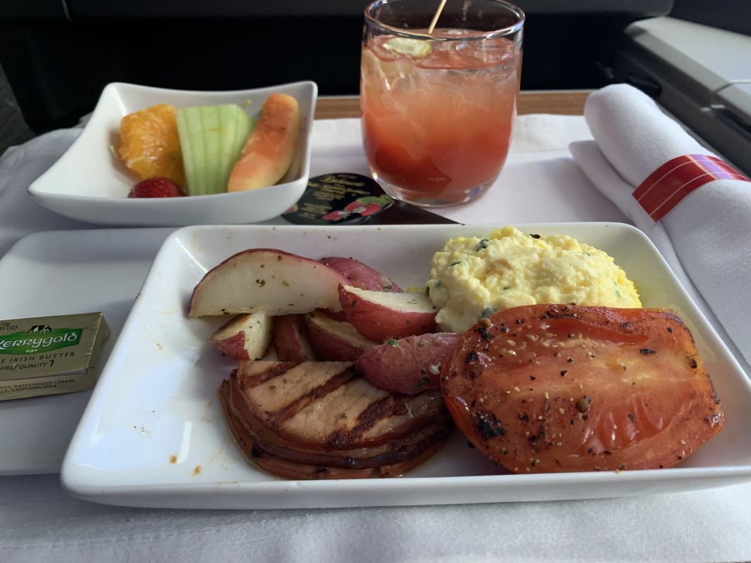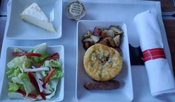 Traditional American Breakfast with scrambled eggs, Canadian bacon, roasted potatoes and herbed tomato (light meal offered prior to arrival)