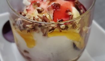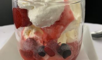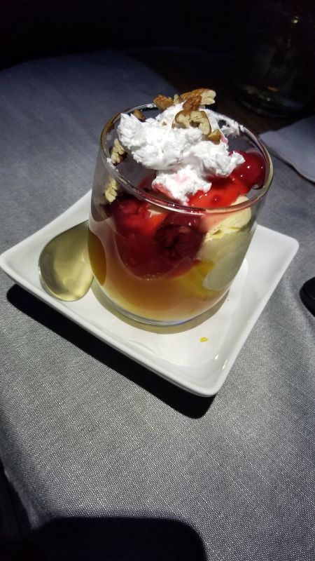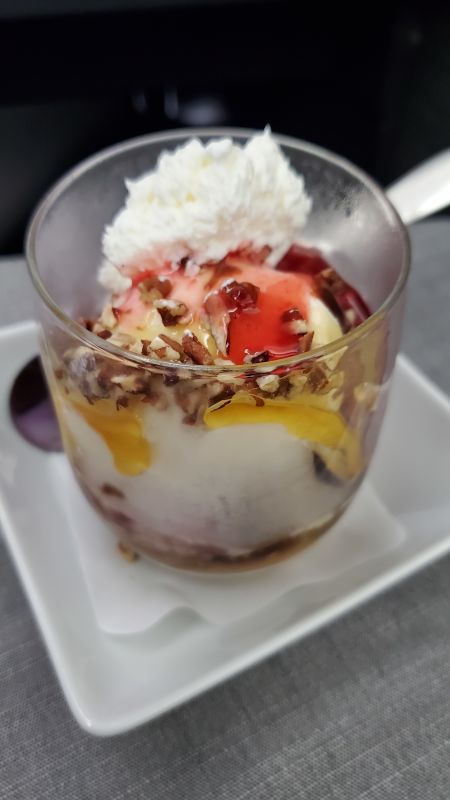 Dinner dessert: traditional ice cream sundae served with hot fudge, butterscotch, seasonal berry toppings, whipped cream and pecans