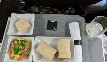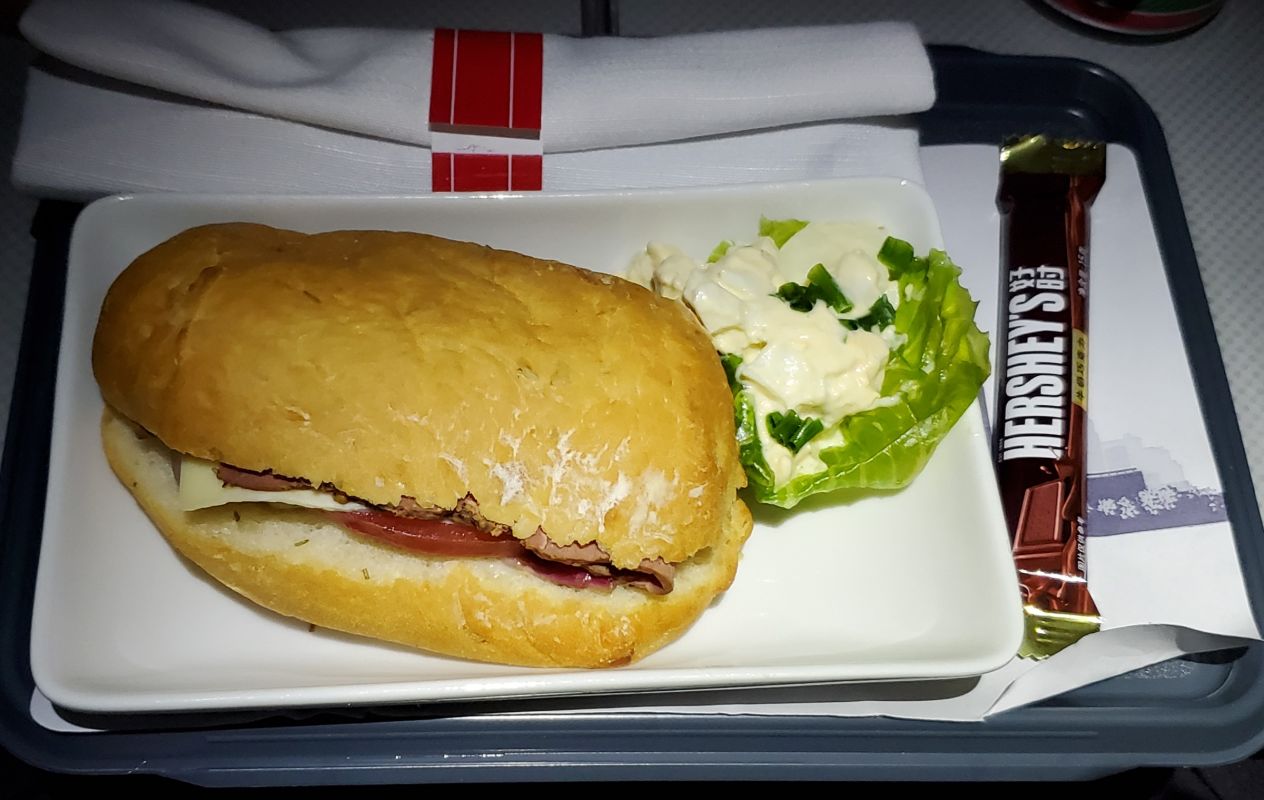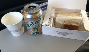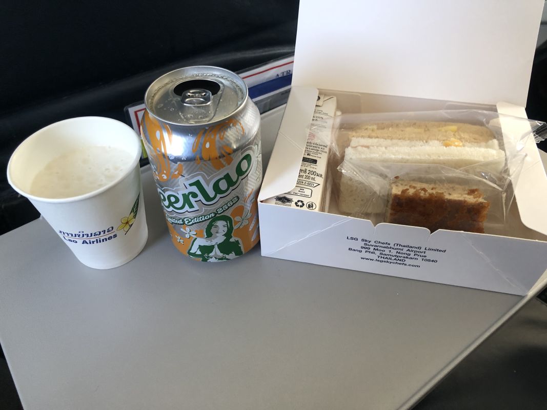 Two prepackaged sandwiches, juice box, and BeerLao with paper Dixie cup. The free beer and aircraft round this meal up to a 2