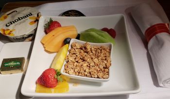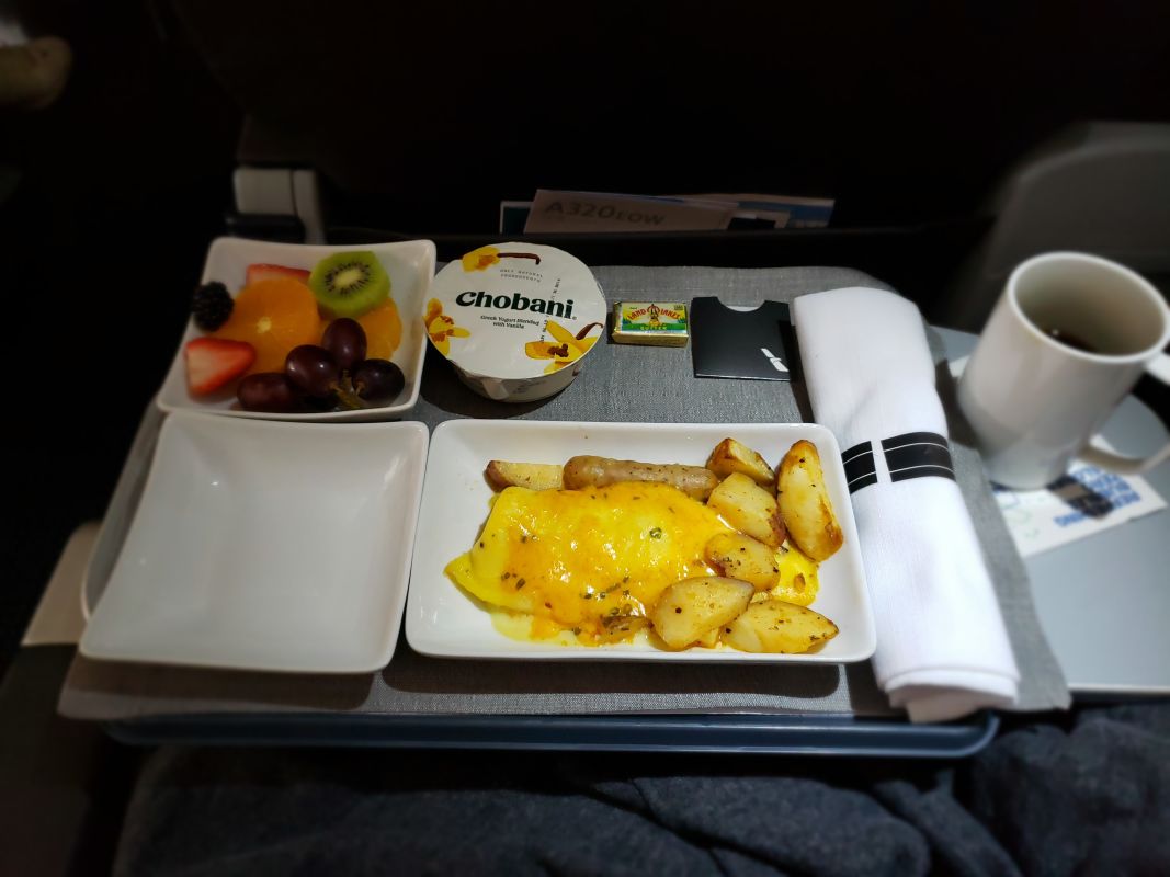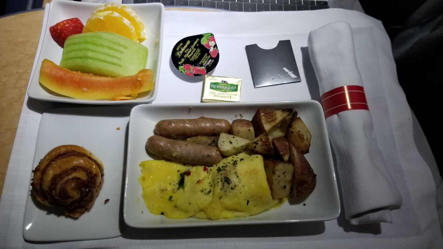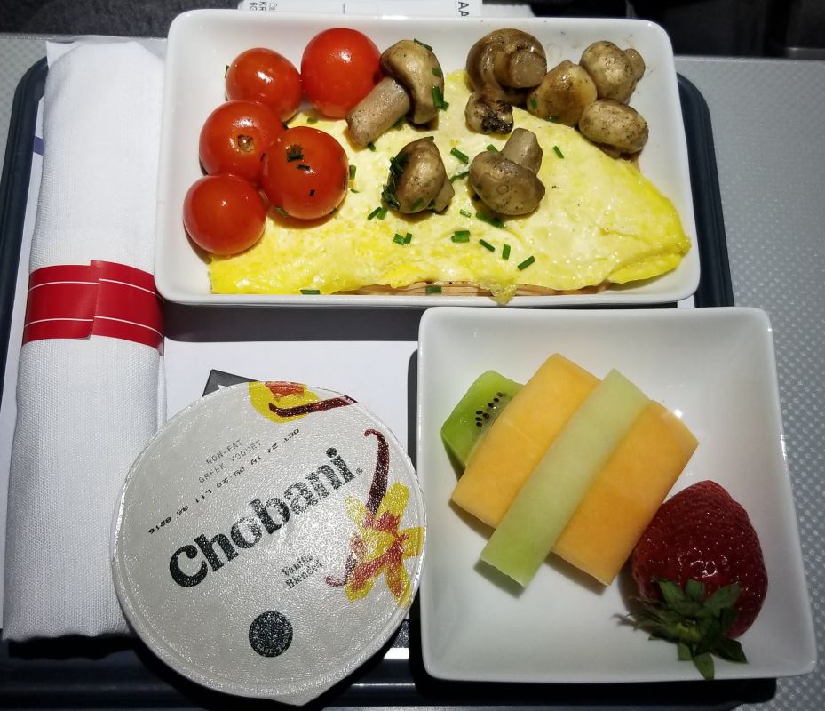 Breakfast: three cheese and poblano pepper omelette with chicken apple sausage and roasted potatoes & fresh fruit bowl, granola and Greek yogurt