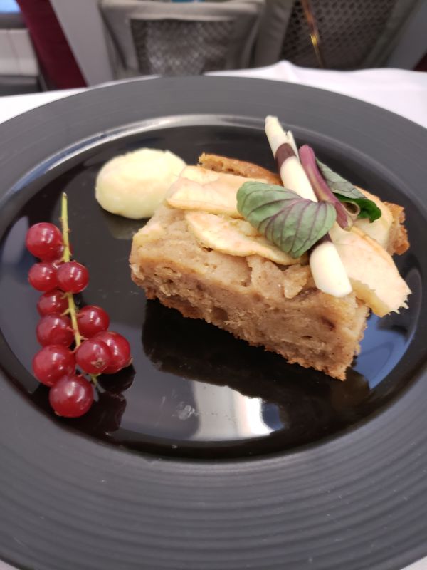 Apple and cinnamon pudding: a rare miss with QR catering, a bit dry, not much flavor, and the "vanilla sauce" tasted more like supermarket frosting than anything edible. The berries were fresh and tart though!