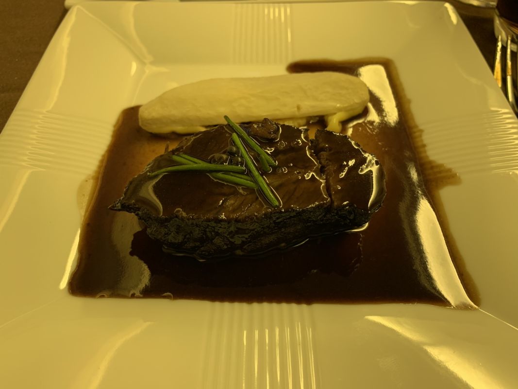 Beef short rib with cauliflower mash and broccolini. Short rib was more like a hockey puck that tasted like beef jerked. Cauliflower mash and broccolini were delicious.