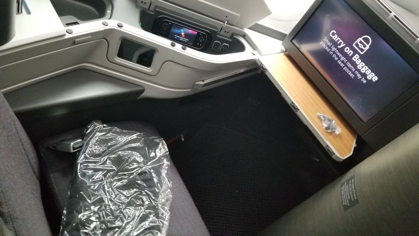 JAL reconfigured 777-200 reverse herringbone product. Felt tighter with weird foot well angle. Weird choice for the table to fold down as well. Comfortable seat though, with side cubby storage with mirror. Plugs easily accessible and great IFE Seat 4A