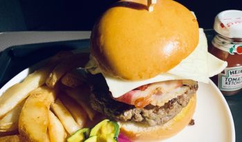 Hamburger on a brioche bun with sharp cheddar cheese, lettuce, tomato, dill pickle slices, pickled onions and chips