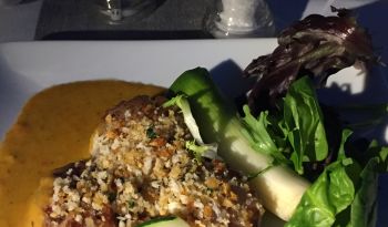Shrimp starter, followed by a nice butternut squash soup and salad. Scallops for the main. Each course was tasty. I just wish my appetite were bigger so I could have enjoyed it all!