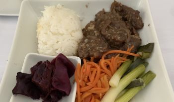 Spicy Asian vegetarian, curries, rice, pre packaged dessert