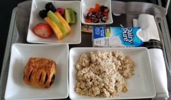 Domestic breakfast: Steel cut oatmeal with various fruit garnishes. Used to having cinnamon alongside. Otherwise was bland and would have ordered the Smoked Fontina Cheese Omelette instead.