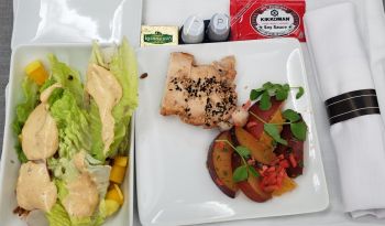 Diabetic meal. Salmon was inedible and asparagus was flaccid. Salad and chicken roll were decent.