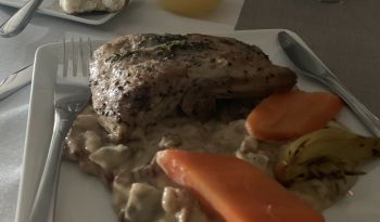 Seasoned Chicken Breast served with Three Pepper Sauce accompanied by Roasted Corn Carolina Grits and seasoned Carrots. Chicken was a bit tough and I didn't care for the Grits.