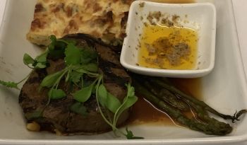 Dinner main plate: porcini crusted filet mignon served with chanterelle mushroom corn pudding, roasted asparagus and Cafe de Paris butter