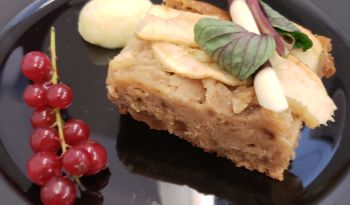 Shanghai fried noodles with minced chicken and chili sauce. Served with seasonal greens, Italian dressing, and apple crumble with vanilla sauce
