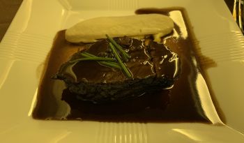 Lunch main course: marinated lamb with herbes de Provence in red wine demi-glace sauce served with roasted vegetables and cassava puree
